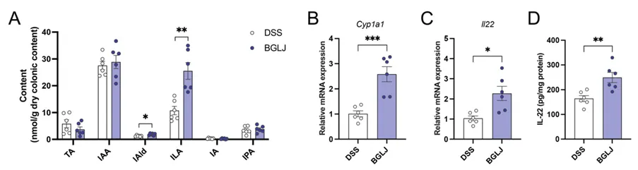BGLJ干预提升了结肠炎小鼠肠道内容物中ILA的水平。与此同时,结肠组织中AhR通路的下游靶基因Cyp1a1以及Il22的表达量均显著上调,IL-22的蛋白水平也相应升高。这些发现提示,BGLJ合生元对结肠炎的保护作用,可能部分归因于其促进了LJ及其代谢产物ILA的产生,进而通过激活肠道“ILA-AhR-IL-22”这一调节轴实现了对肠道免疫平衡的调节与屏障修复。