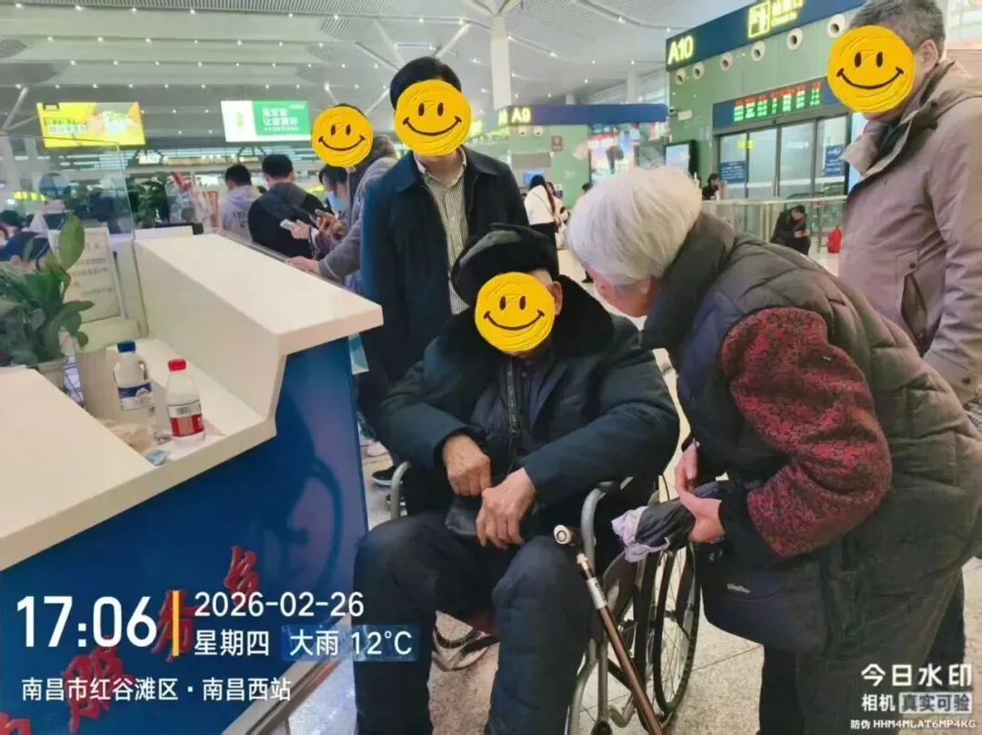 2月26日下午两点半左右,抚州市救助管理站接到南昌西站工作人员紧急求助:一名家住抚州市高新区某小区的87岁老人独自滞留车站,情况紧急,急需帮助。