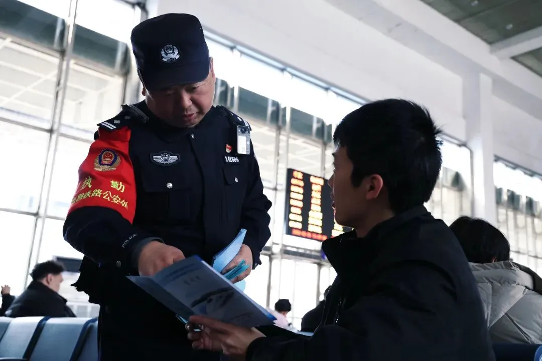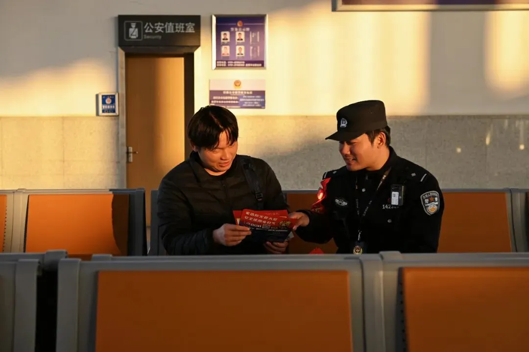 故事:在车站警务室门前,民警为候车旅客递上消防宣传册,细致讲解消防安全知识,用坚守为春运添上一抹温暖。