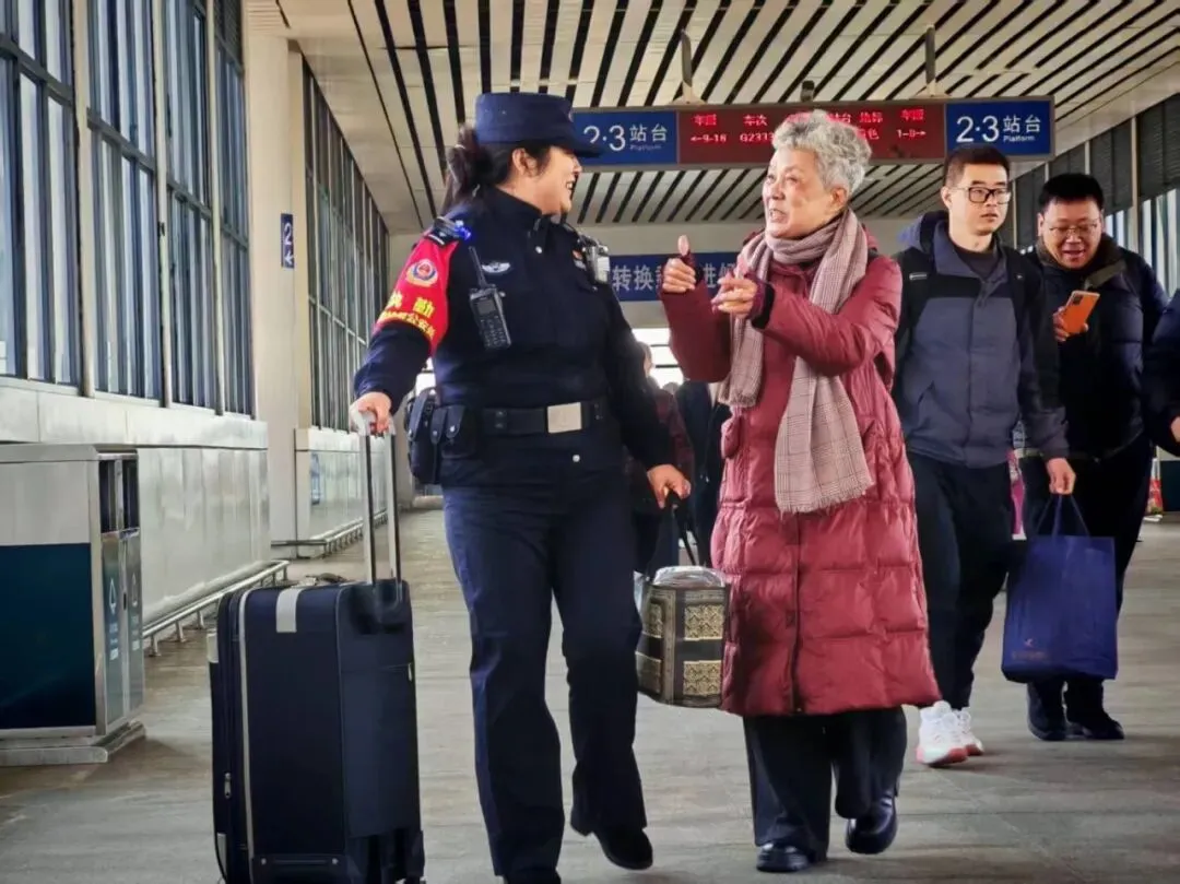 故事:春运路上,鹰潭北站派出所民警帮助独自出行的老人搬运行李,老人对着民警竖起大拇指,满脸笑意地表达感谢。