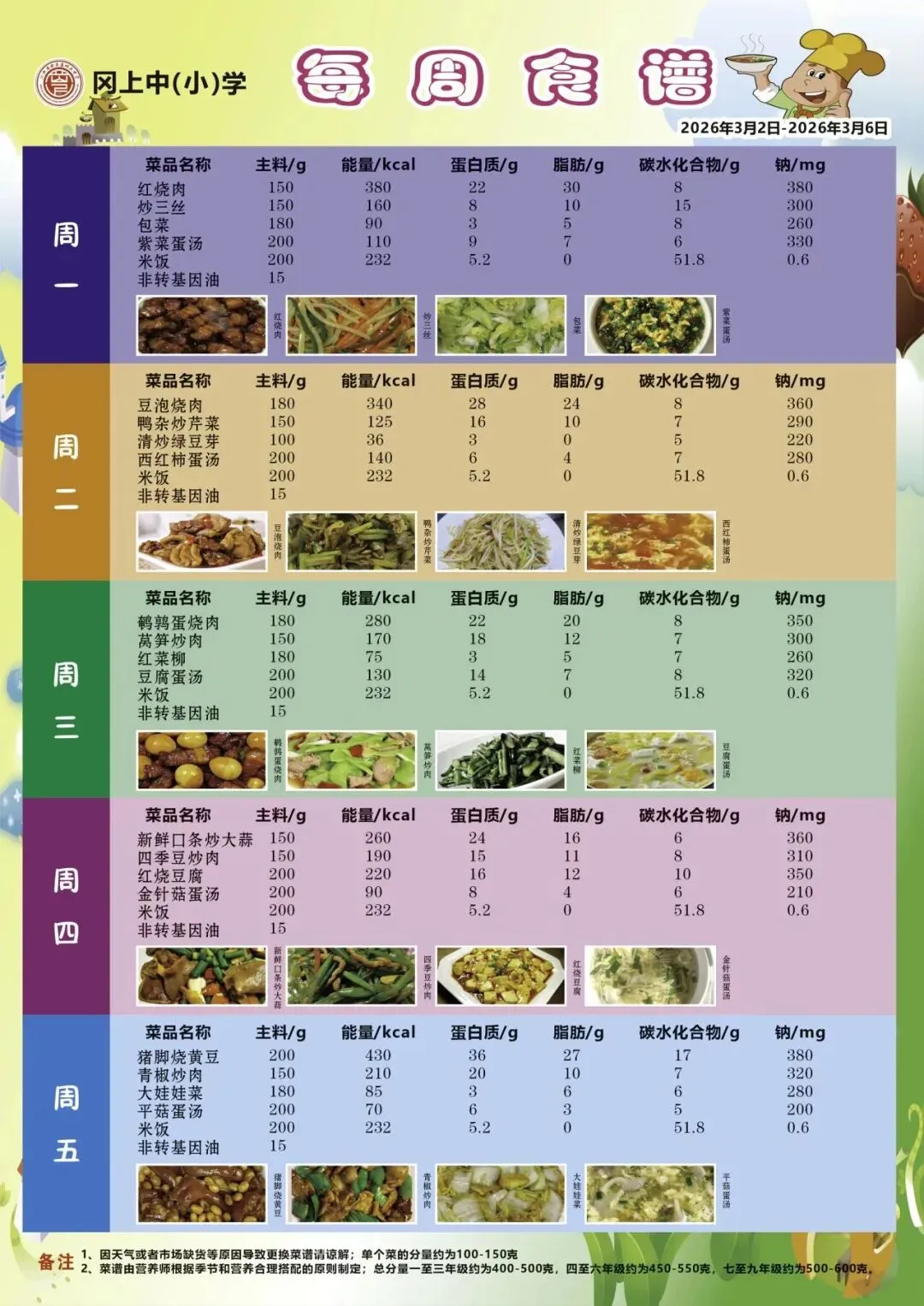 >南昌县冈上中学每周食谱公示(3月2日—3月6日)