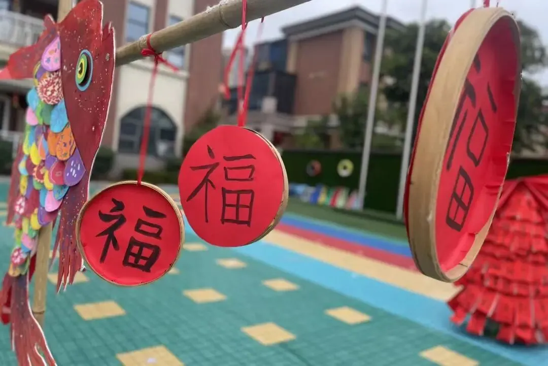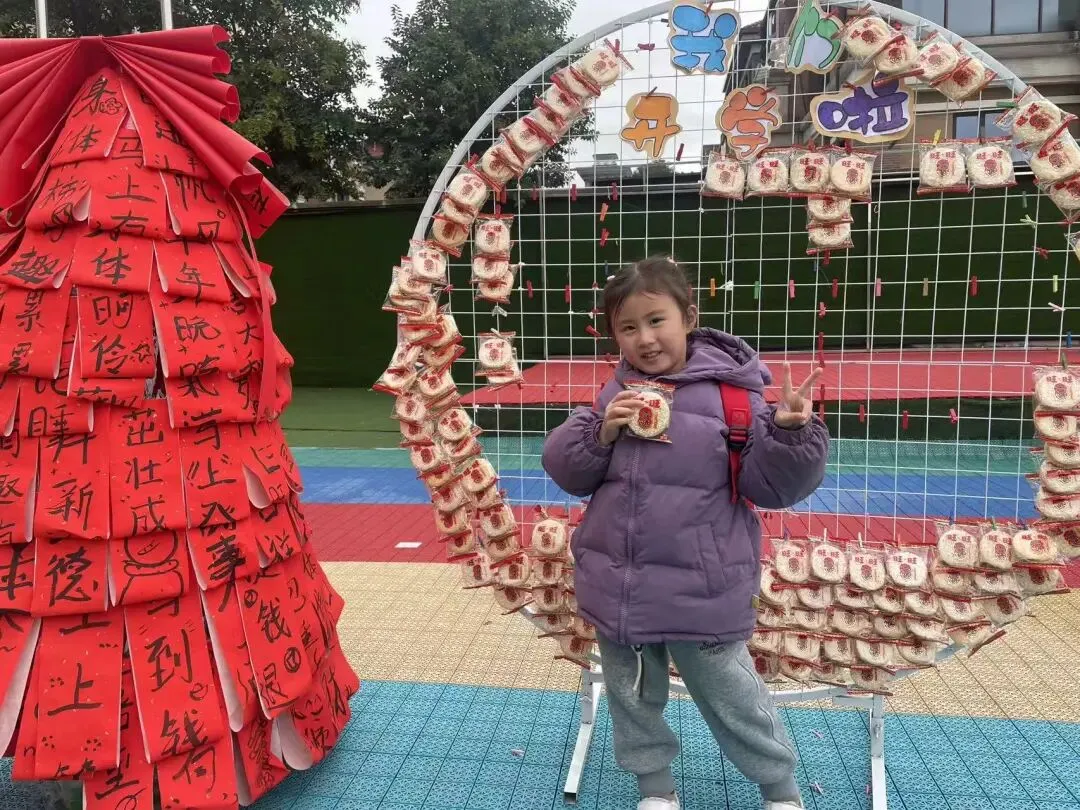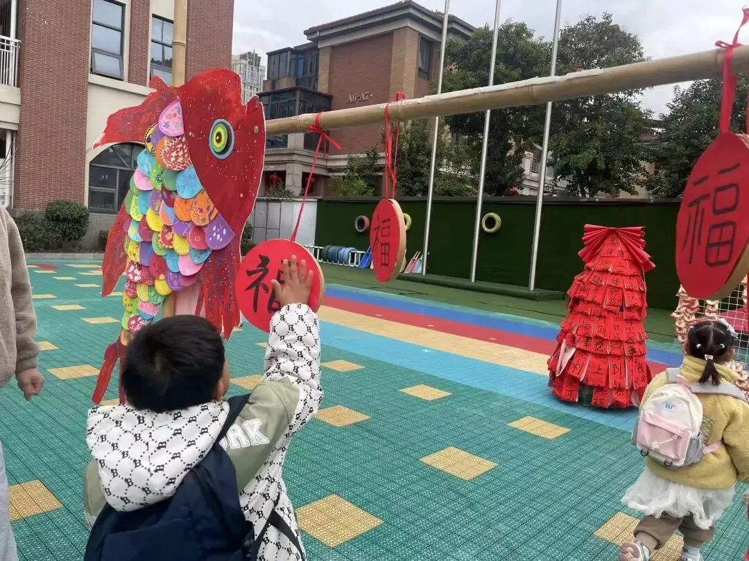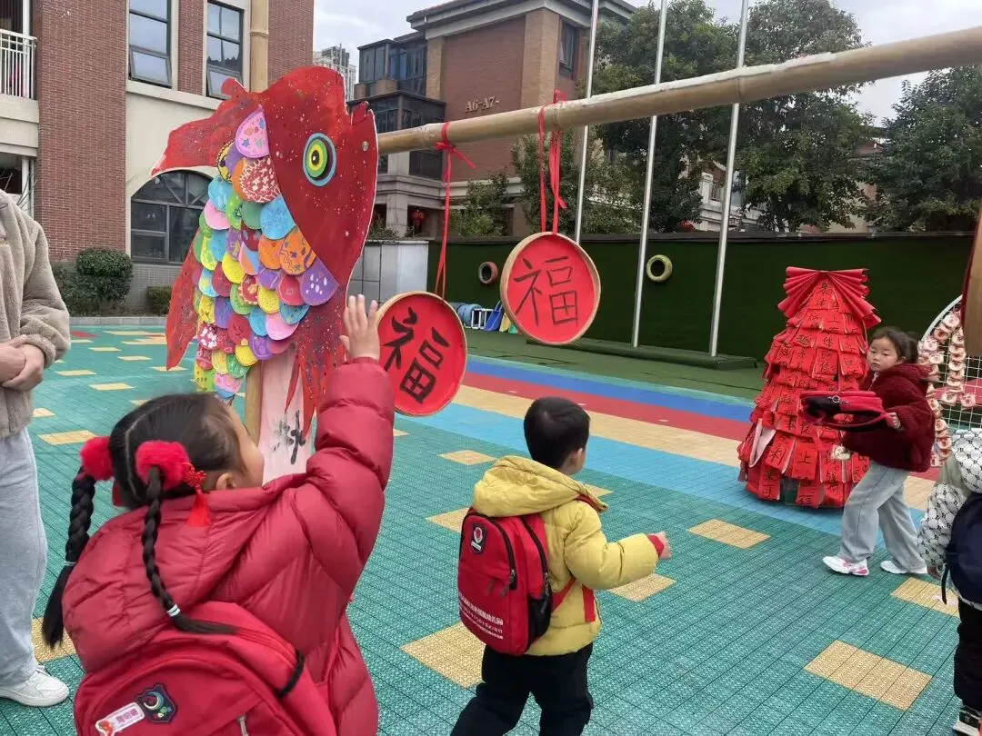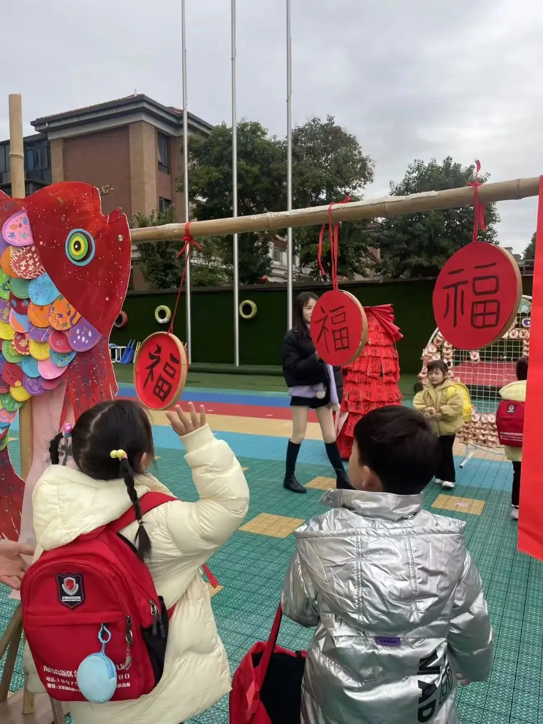 孩子们奋力一跳,触摸高高挂起的“福”字——这一跳,跳出了新学期的活力;这一摸,摸来了整年的福气!