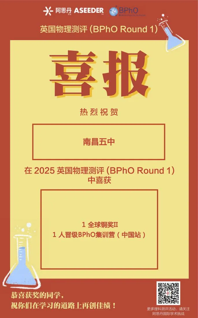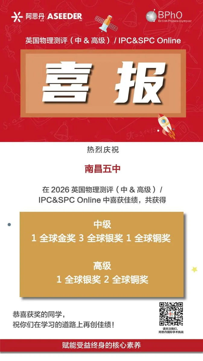 热烈祝贺南昌五中国际部学子在2025年英国物理测评(BPhO Round1)、2026年英国物理测评(中&高级)(IPC&SPC Online)、2026未来商业领袖研习社CBPA全国站中喜获佳绩。