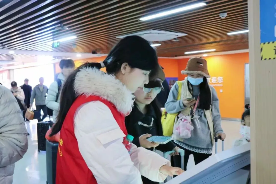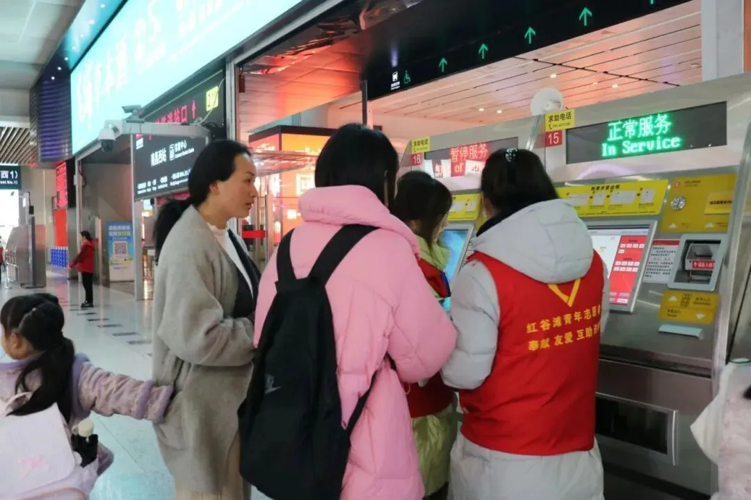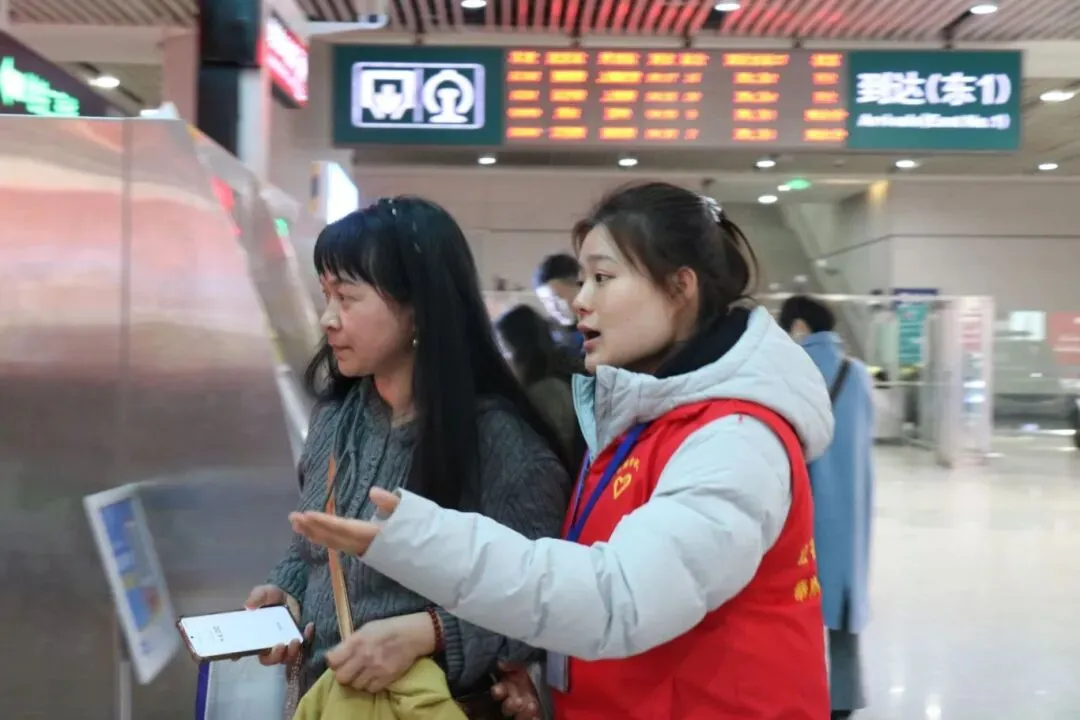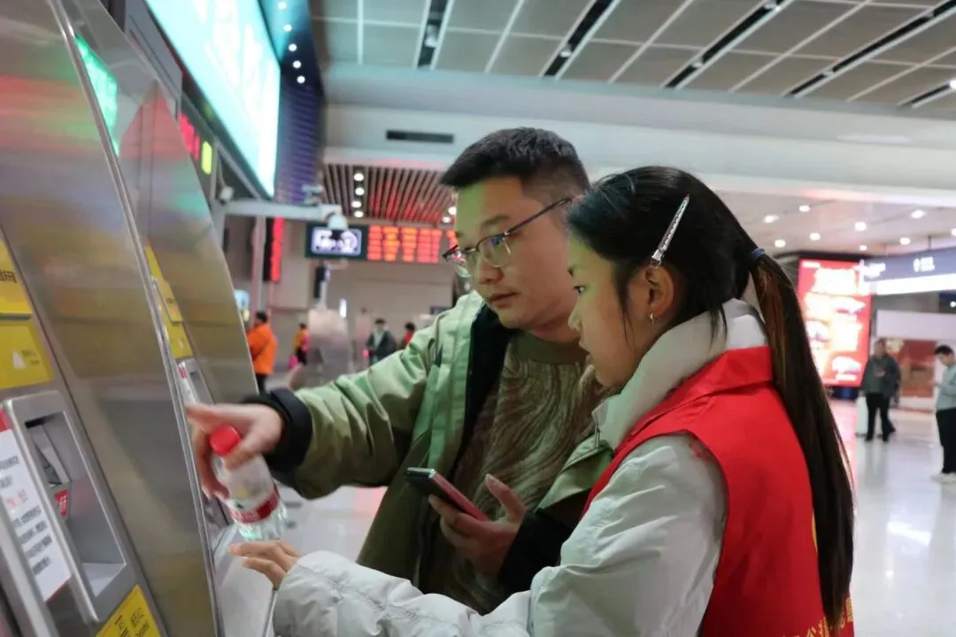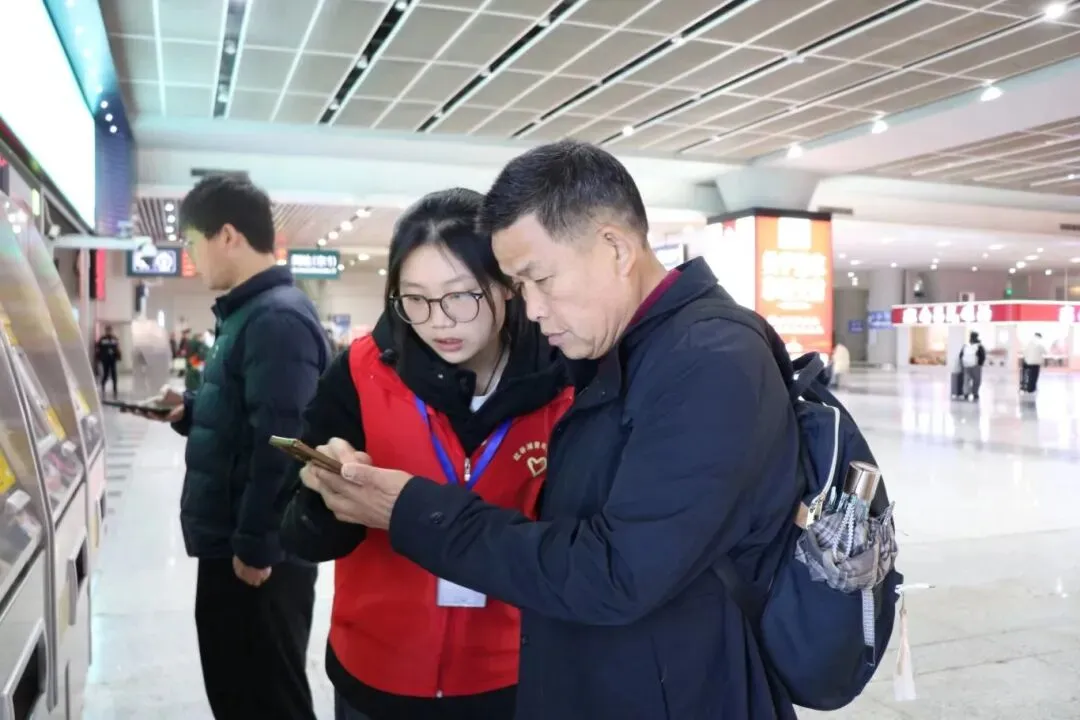 地铁票售卖区,志愿者们耐心引导旅客操作自助购票机,讲解购票流程与地铁线路,助力旅客快速购票、顺利换乘。上下扶梯处,志愿者们时刻留意旅客需求,主动帮扶携带大件行李、老人、小孩等旅客上下扶梯,全程守护出行安全。