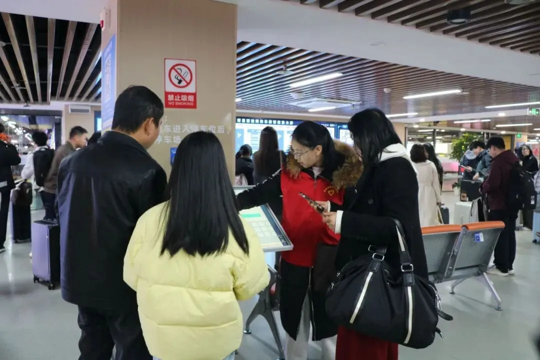面对网约车等候的旅客高峰,志愿者们耐心细致地指引乘车点位、讲解叫车流程,帮助旅客高效找到乘车位置,减少候车等待时间。