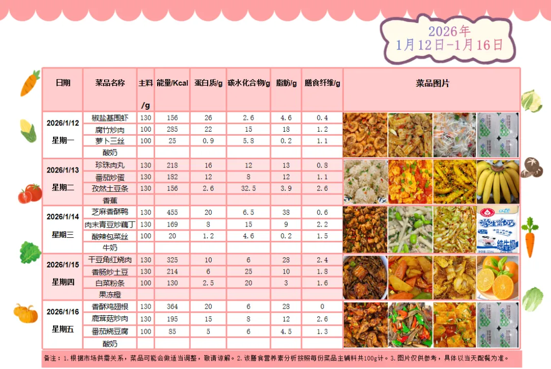 26年1月12~16日菜谱公示