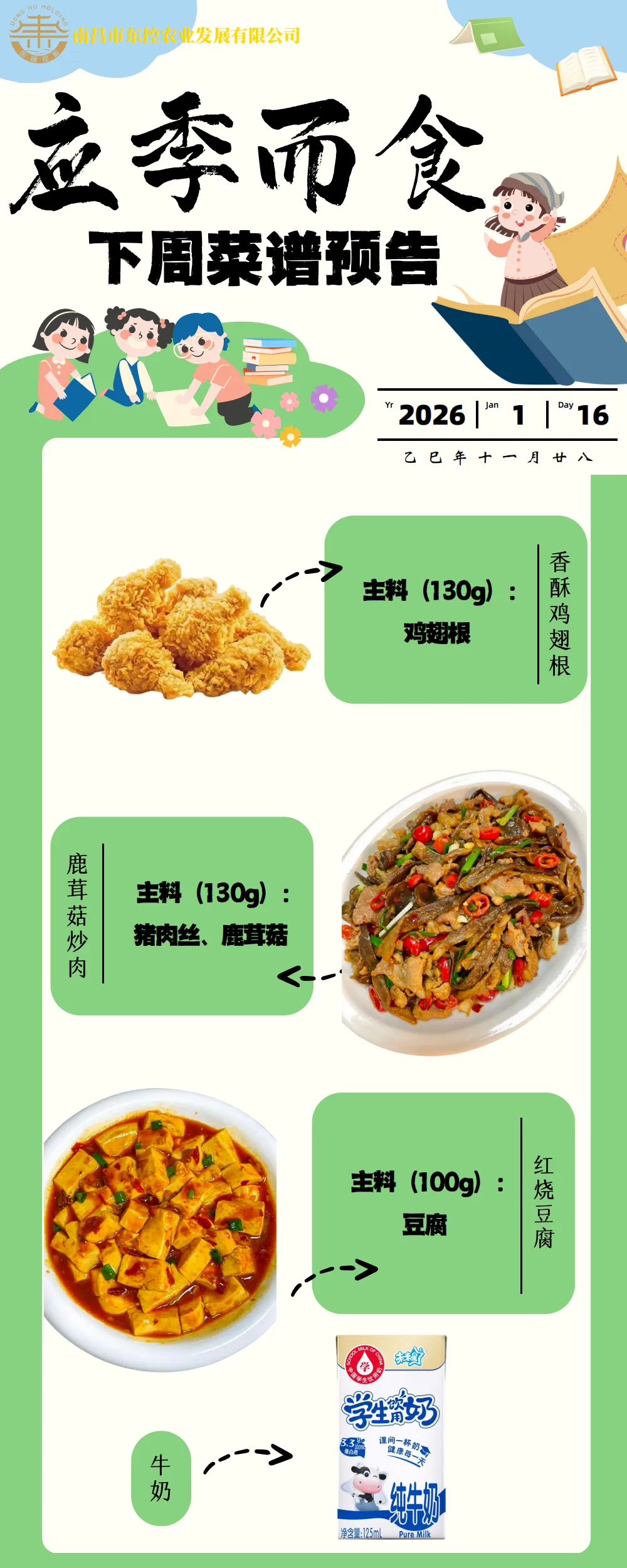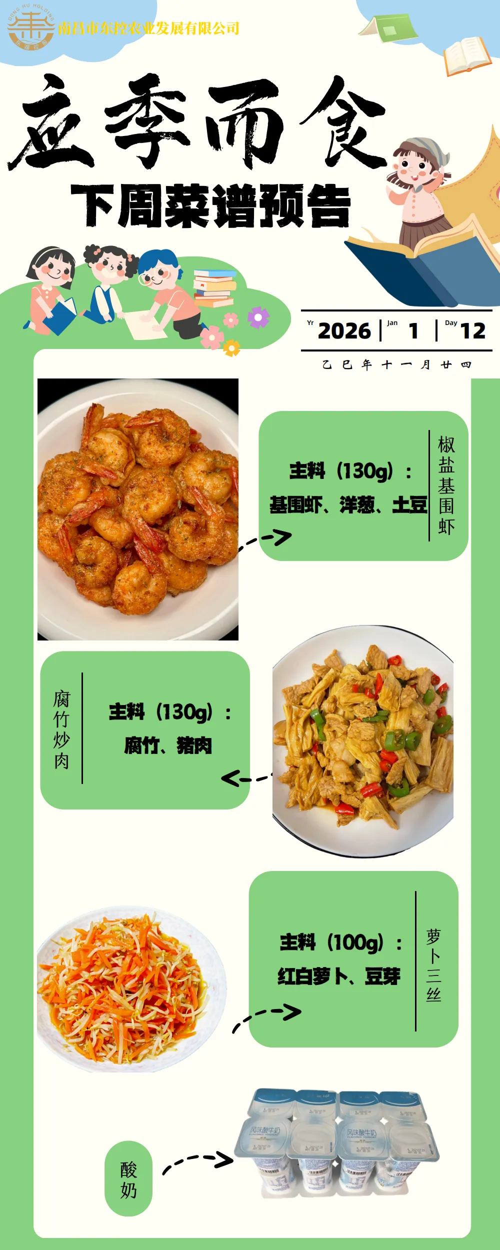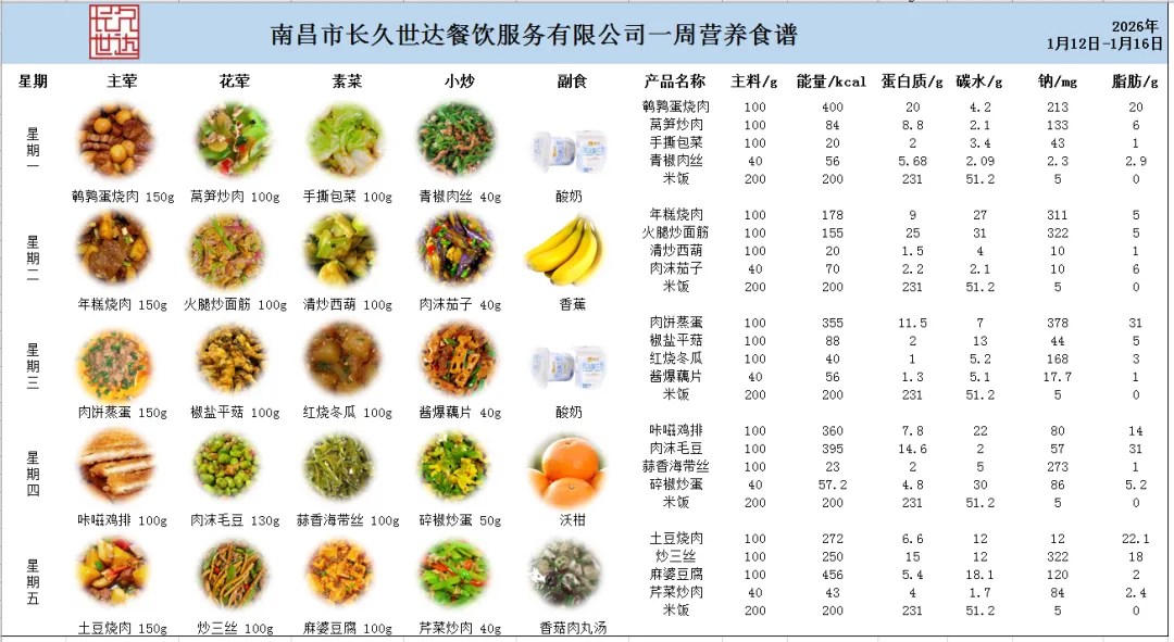根据《南昌市中小学校(幼儿园)配送餐管理办法》和《南昌市加强校园餐管理措施十条(试行)》文件精神,现将学校2026年1月12日~16日周带量菜谱公示如下。