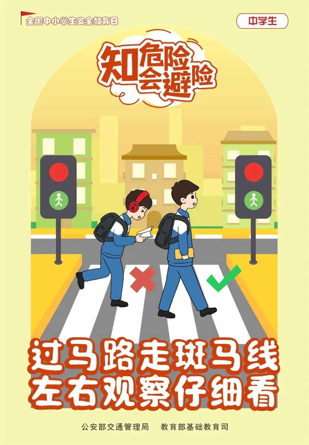 五、学生在上学、放学路上通过路口或横过道路时要走人行横道(斑马线)或者过街天桥,不闯红灯、不翻越隔离护栏,切勿在道路上嬉戏、打闹,不做“低头族”,注意观察、谨慎通过。