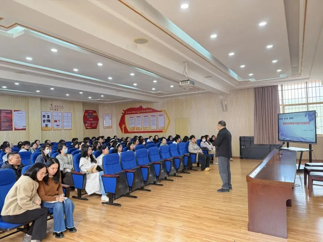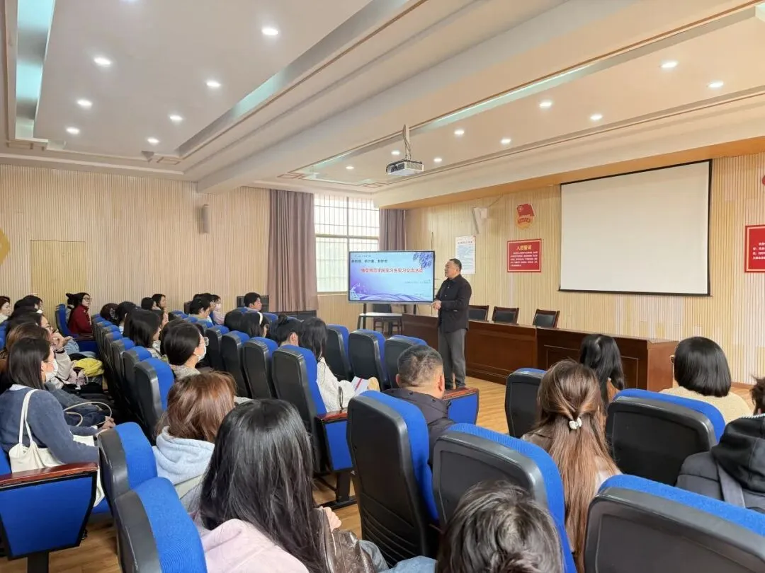 教务处李主任主持会议,代表学校对实习生们的到来表示最热烈的欢迎。随后,李主任对实习生们提出了殷切期望与诚挚建议: 第一,完成角色转换,尽快从“学生”转变为“学生与教师”的双重角色,既要虚心学习,也要做好为人师表的准备;第二,深入教学一线,鼓励大家多听课、多备课、多参与教研活动。第三,享受校园生活,希望实习生们能融入我们这个温暖的大家庭,与指导老师、学生建立深厚的友谊。