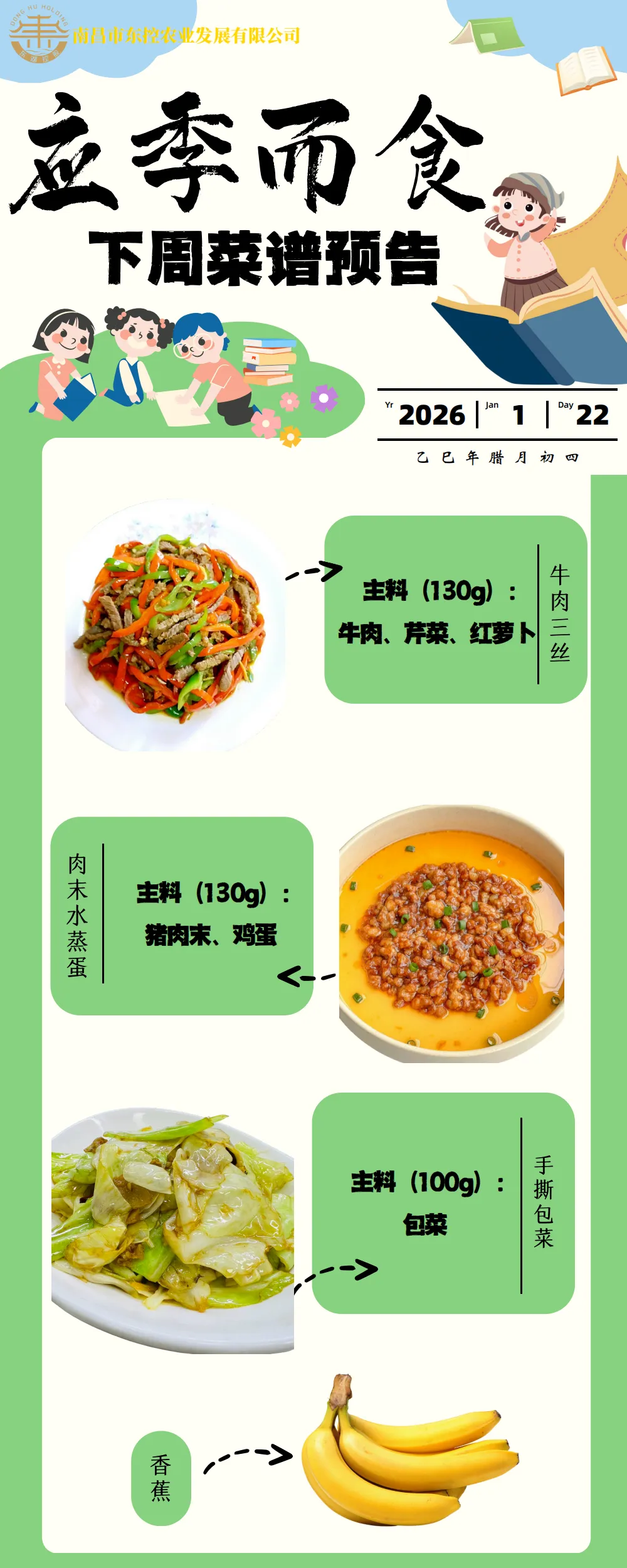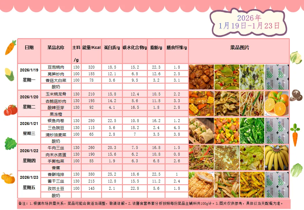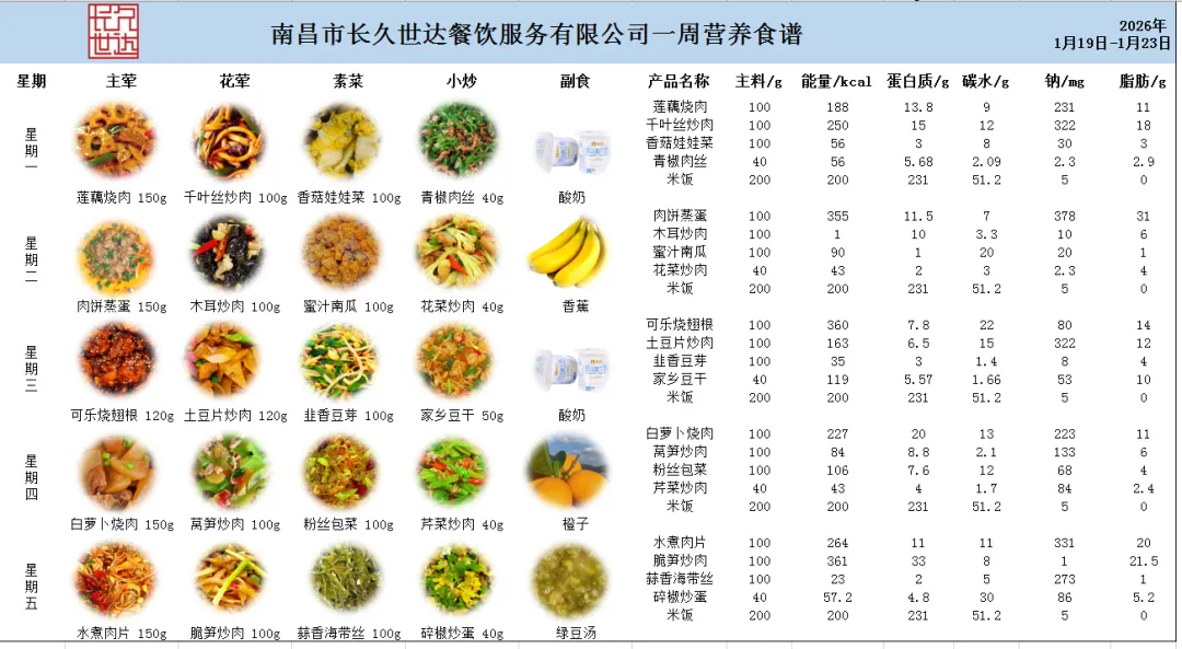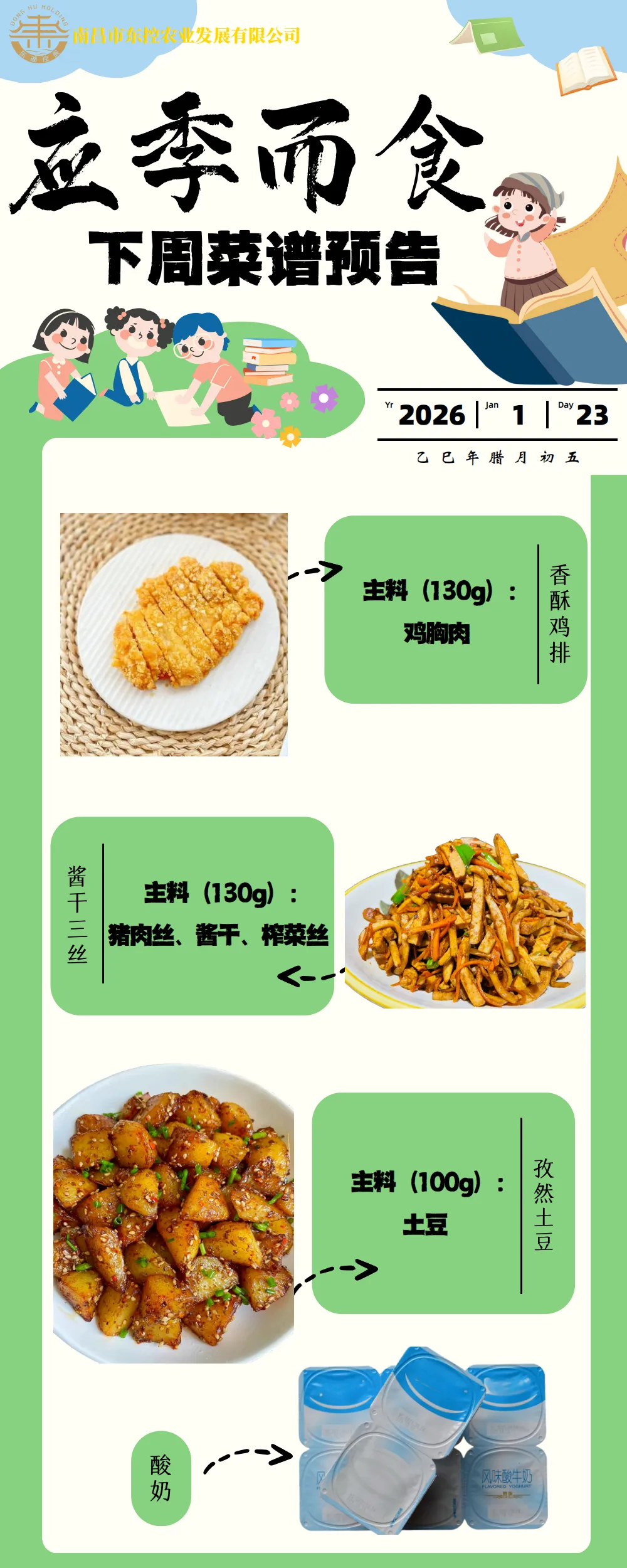 根据《南昌市中小学校(幼儿园)配送餐管理办法》和《南昌市加强校园餐管理措施十条(试行)》文件精神,现将学校2026年1月19日~23日周带量菜谱公示如下。