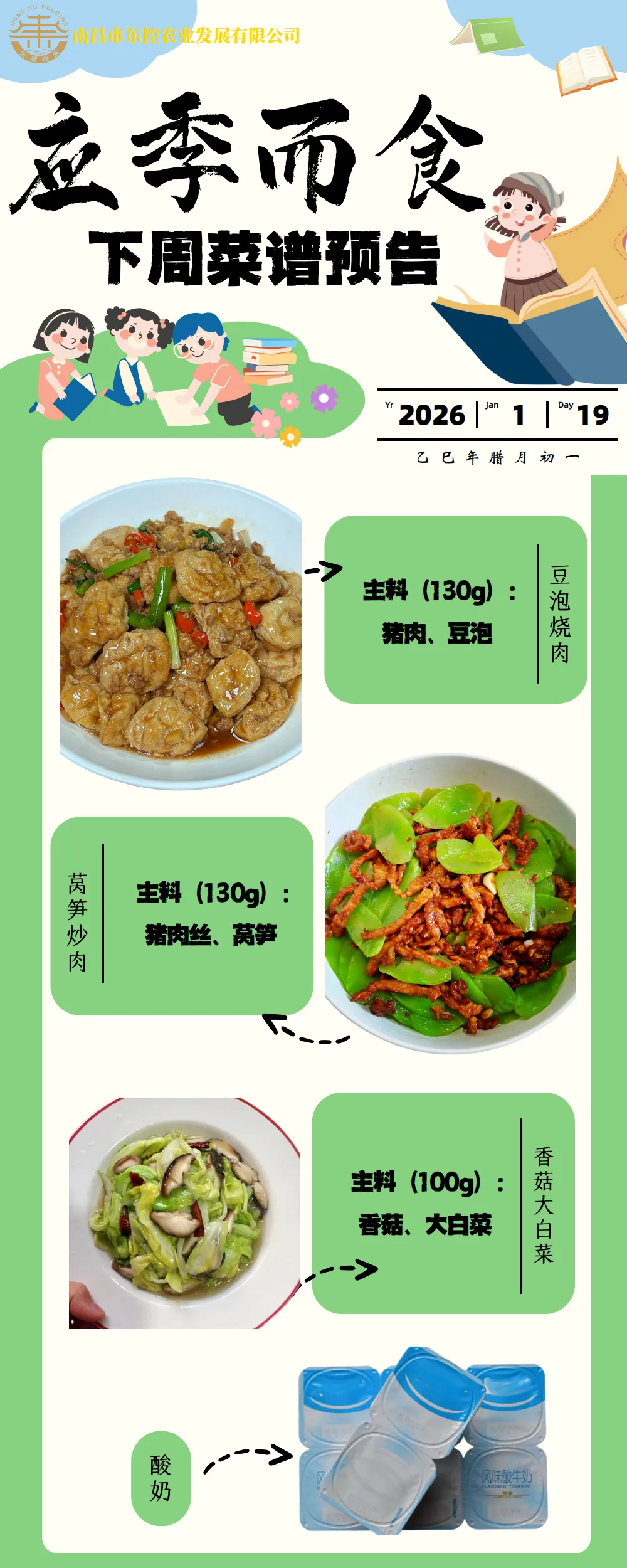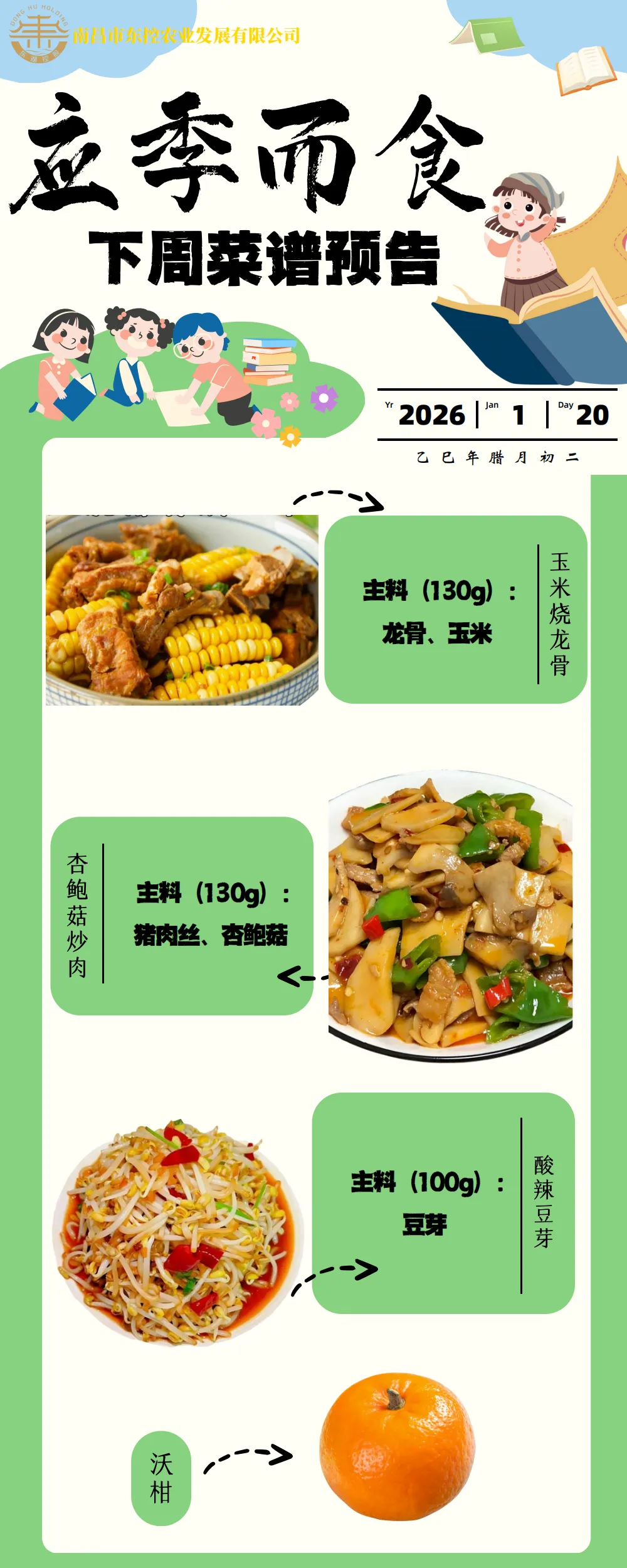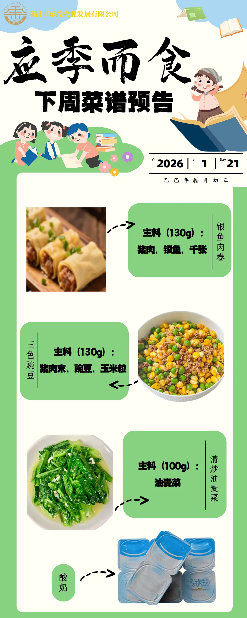 根据《南昌市中小学校(幼儿园)配送餐管理办法》和《南昌市加强校园餐管理措施十条(试行)》文件精神,现将学校2026年1月19日~23日周带量菜谱公示如下。