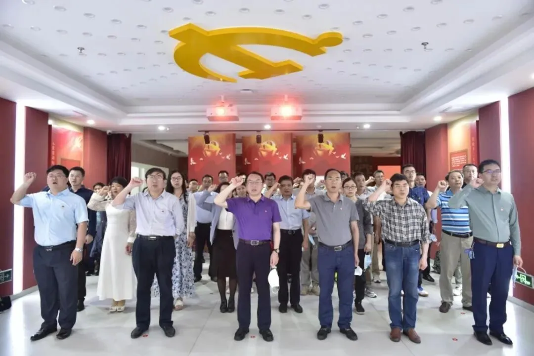 在入党宣誓大厅,面对党旗,全体党员干部庄严地举起右手,重温入党誓词。