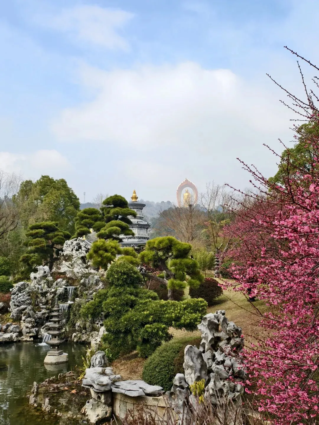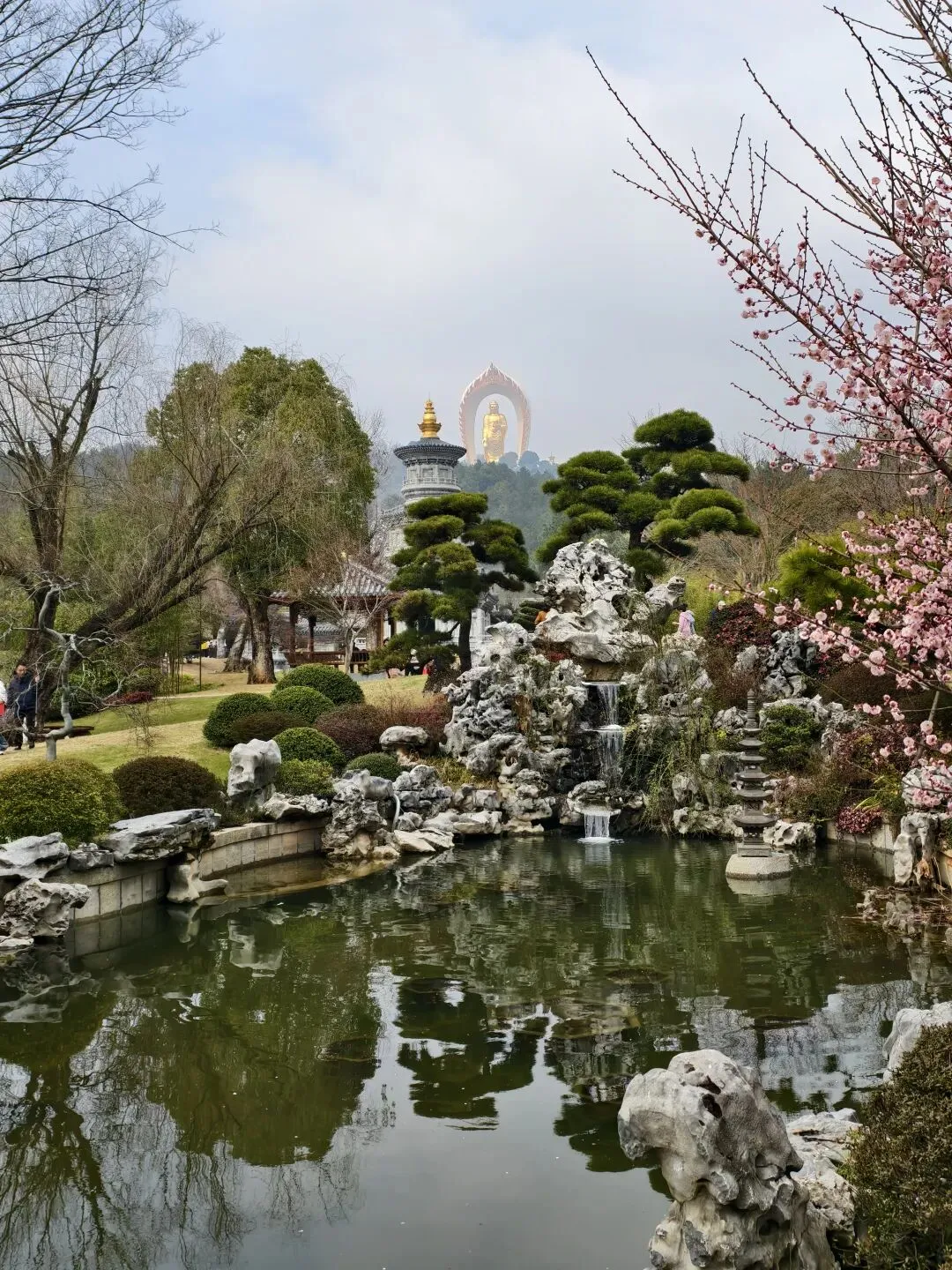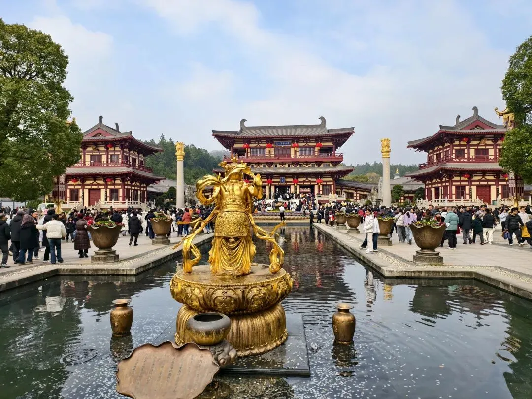 寺中景色很美,有许多盛开的梅花,人们纷纷在梅花下拍照合影。有毛茸茸的绿色的草坪,有孩童在玩耍。