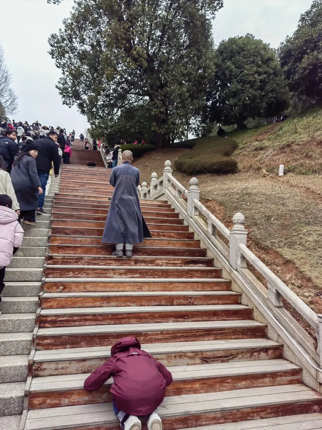 走在拥挤的台阶上,印象最深的是单独留出的一条向上跪拜的阶梯。时有儿童过去踩踏,被家长叫回,带着敬畏的感觉悄声训斥儿童,说是人家单独走的,不能走那里。