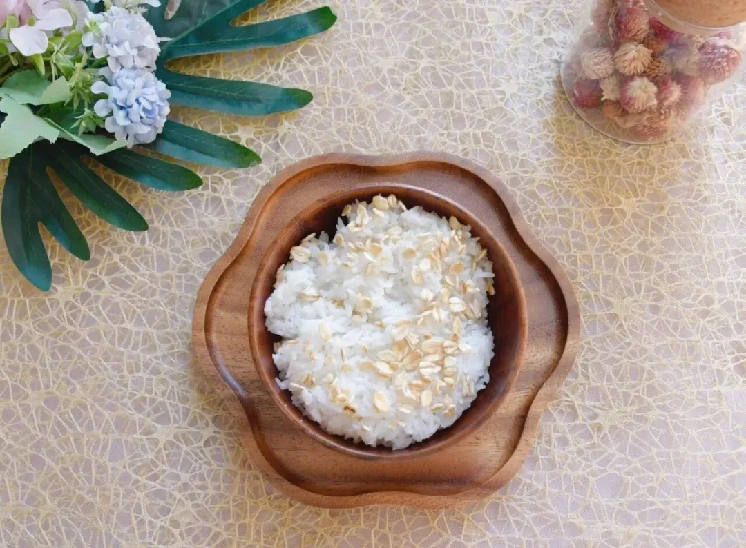 基围虾、花椰菜烧肉、油麦菜、紫菜蛋花汤、燕麦(山姆)香米饭