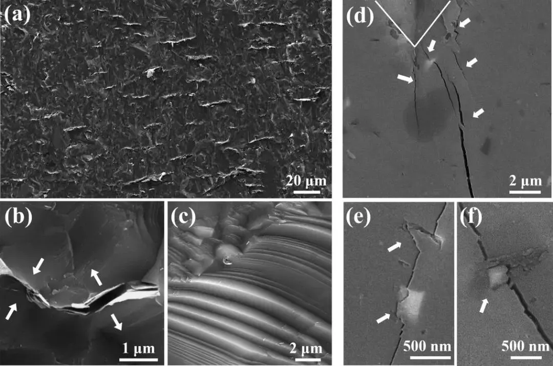 实验结果表明,该优化复合材料DS@MBNS的力学性能显著提升:抗弯强度达到477MPa,较传统SiC陶瓷提高94.5%;断裂韧性达到6.02MPa·m1/2,提升接近50%。这种增强效应来源于纳米片的微观增强机制:当裂纹在陶瓷内部扩展时,横向分布的氮化硼纳米片能够使裂纹偏转并形成桥接结构,从而分散应力并阻止裂纹快速扩展,提高材料抗断裂能力。
