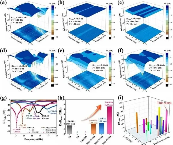 与此同时,该材料还展现出优异的电磁波吸收性能。这主要得益于其特殊的多相结构体系:半导体SiC基体、介电氮化硼纳米片,以及烧结过程中形成的导电硅化镍(Ni2Si)共同构建了复杂的电磁耗散网络。这种结构可在材料内部形成多个电磁能量耗散界面,使入射电磁波通过多重反射、界面极化和导电损耗等机制逐步衰减。