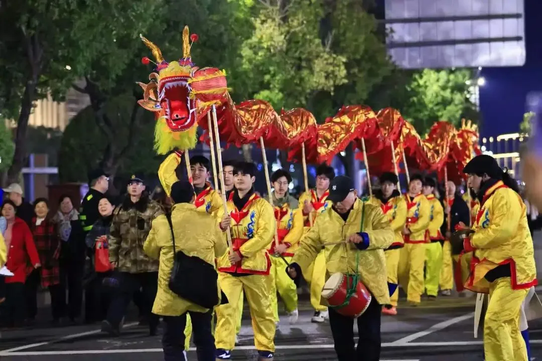 18时整,气势恢宏的得胜鼓骤然敲响,震天的鼓声拉开了巡游暖场的序幕,也点燃了现场观众的热情。紧接着,《中国龙》鼓舞激昂上演,鼓点铿锵,舞姿豪迈,尽显中华龙的磅礴气势;新年快乐舞蹈串烧活力四射,欢快的节奏让现场观众跟着拍手叫好;龙狮共舞环节更是将暖场氛围推向高潮,祥龙昂首,瑞狮欢腾,每一个动作都寓意着吉祥如意、福气满满。