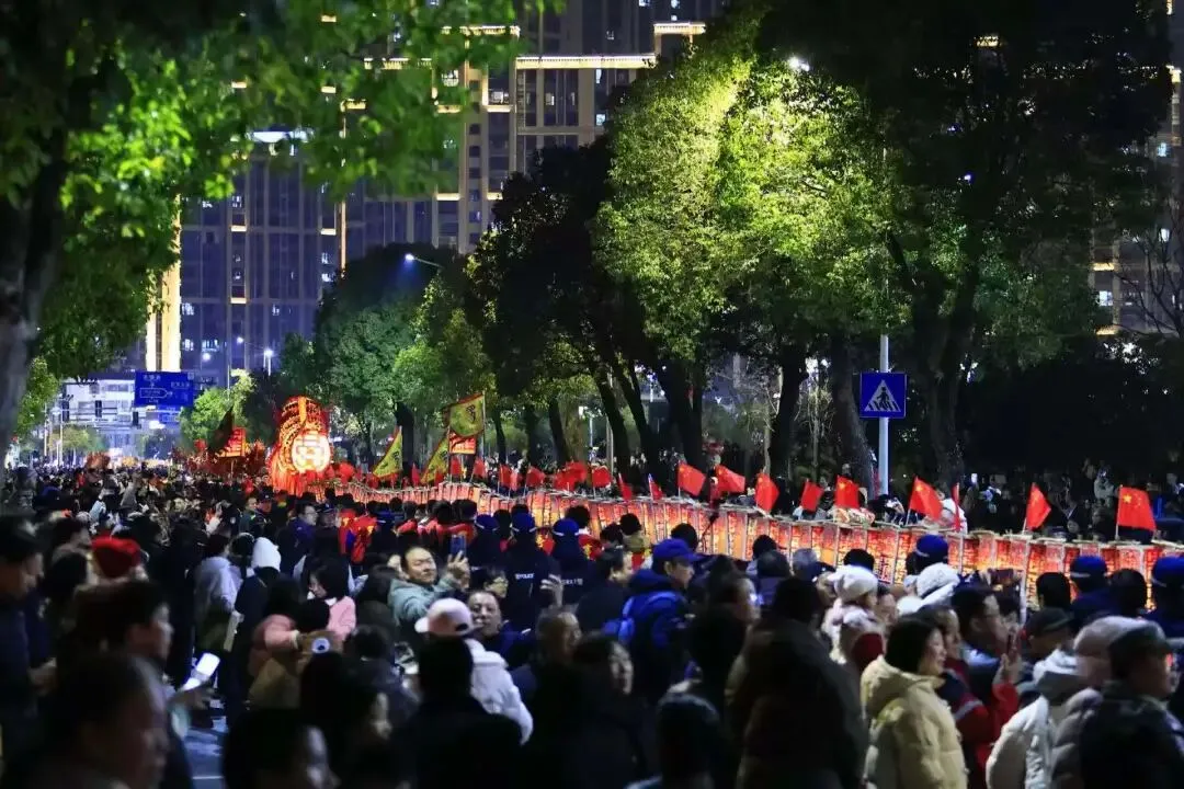 招贤大道与磨盘山南路交会口、磨盘山森林公园正门、八面山路与萧史街交会口三个展演点,成为了民俗展示的舞台,巡游队伍在展演点轮番表演,龙狮腾跃,民俗欢歌,现场观众里三层外三层,欢呼声、喝彩声此起彼伏,整条巡游路线成为了一片欢乐的海洋,浓浓的年味萦绕在湾里的大街小巷。20时30分,巡游队伍顺利抵达梅岭云端索道广场,这场持续两个小时的民俗盛宴在欢声笑语中落下帷幕,但现场观众的热情依旧未减,大家意犹未尽,纷纷回味着这场精彩的民俗之旅。