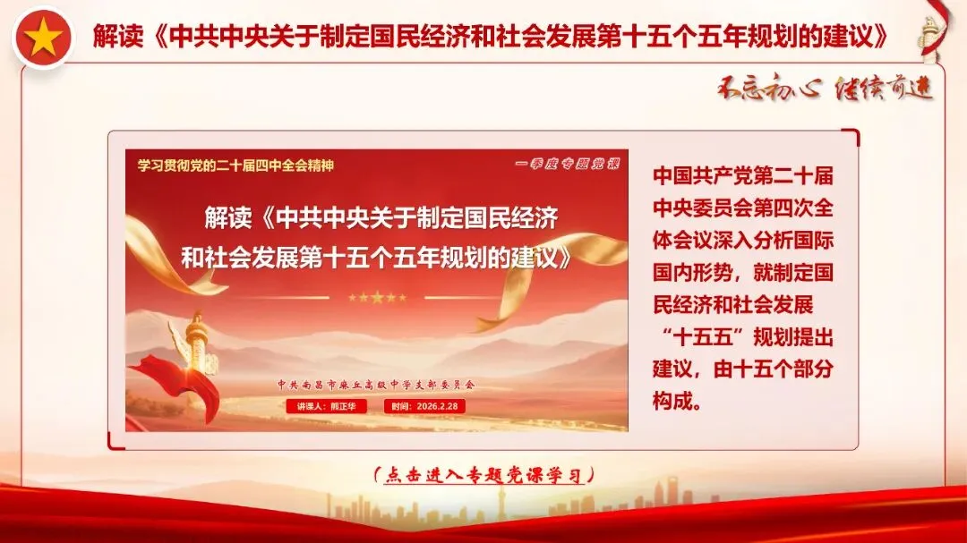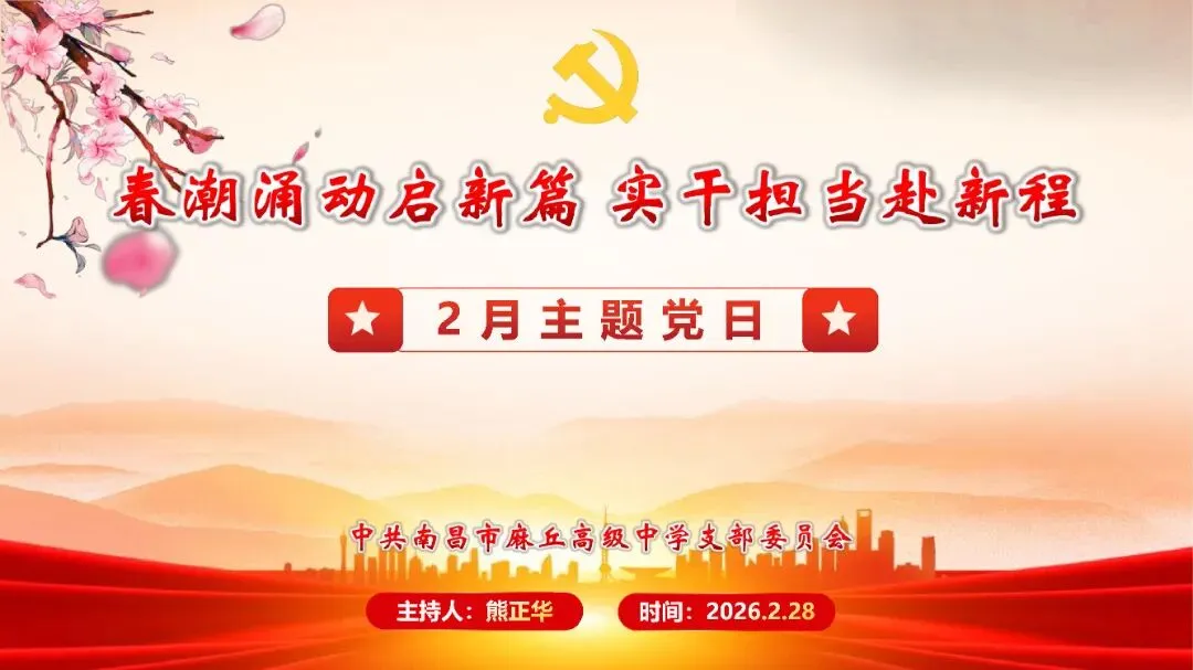 重任呼唤担当,实干创造未来。党的二十届四中全会对“十五五”时期经济社会发展作出战略部署,要更加紧密地团结在以习近平同志为核心的党中央周围,坚持以习近平新时代中国特色社会主义思想为指导,深入贯彻党的二十大和二十届历次全会精神,认真落实四中全会部署,深刻领悟“两个确立”的决定性意义,增强“四个意识”、坚定“四个自信”、做到“两个维护”,切实把思想和行动统一到党中央对形势的科学判断和决策部署上来,坚持稳中求进工作总基调,完整准确全面贯彻新发展理念,加快构建新发展格局,着力推动高质量发展,保持社会和谐稳定,持之以恒推进全面从严治党,以历史主动精神克难关、战风险、迎挑战,努力实现“十五五”良好开局,不断开创以中国式现代化全面推进强国建设、民族复兴伟业新局面。要始终把政治建设摆在首位,坚持不懈用习近平新时代中国特色社会主义思想铸魂育人,持续强化理论武装,严守政治纪律规矩,确保中央和省委、市委的各项部署要求不折不扣落地生根、见行见效。要把习近平总书记关于教育的重要论述和考察江西重要讲话精神有效转化为工作思路和方法举措,全面贯彻落实全国教育大会、2026年全国教育工作会议和省委教育工作领导小组2026年第一次全体会议精神等,深化改革、勇于创新,攻坚克难、担当实干,努力办好人民满意的教育。为进一步凝聚合力、激发干劲,引导广大党员干部以更加“自信、发奋、齐心”的精神状态投身各项工作,切实把中央决策部署和省委、市委、市委教育工委工作要求转化为生动实践和实际成效。结合市委组织部2月主题党日指导要求,2月28日,组织开展了“春潮涌动启新篇 实干担当赴新程”主题党日活动。