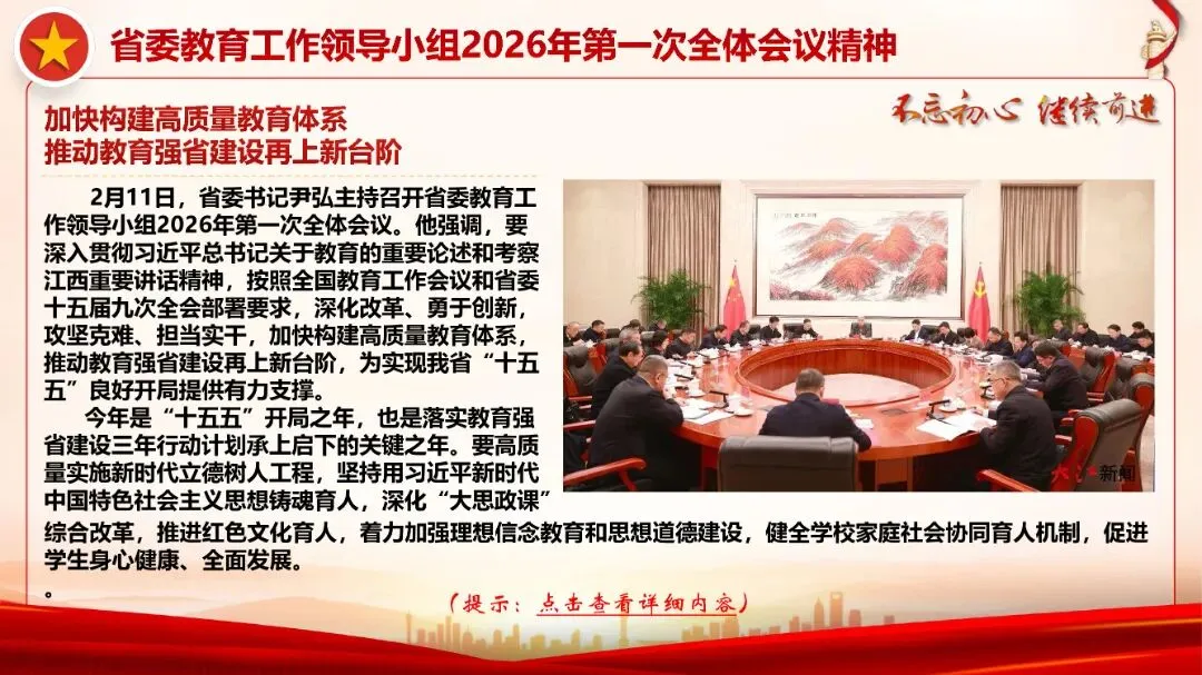 重任在肩,使命光荣。2026年是中国共产党成立105周年,是实施“十五五”规划的开局之年,是教育强国建设三年行动计划承上启下的关键之年。教育是国之大计、党之大计,承载着民族的希望和未来。让我们更加紧密地团结在以习近平同志为核心的党中央周围,坚定信心、真抓实干,攻坚克难、砥砺前行,为加快建设教育强国、实现中华民族伟大复兴作出新的更大贡献!