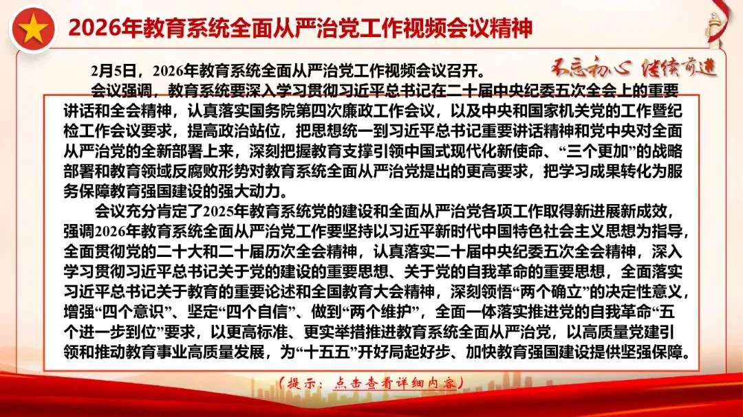 作风建设永远在路上,全面从严治党永远在路上,党的自我革命永远在路上。认真学习贯彻二十届中央纪委五次全会、省纪委十五届六次全会、市纪委十二届六次全会精神,2026年教育系统全面从严治党工作视频会议精神,全面一体落实推进党的自我革命“五个进一步到位”要求,以更高标准、更实举措推进全面从严治党,以高质量党建引领和推动学校教育事业高质量发展。
