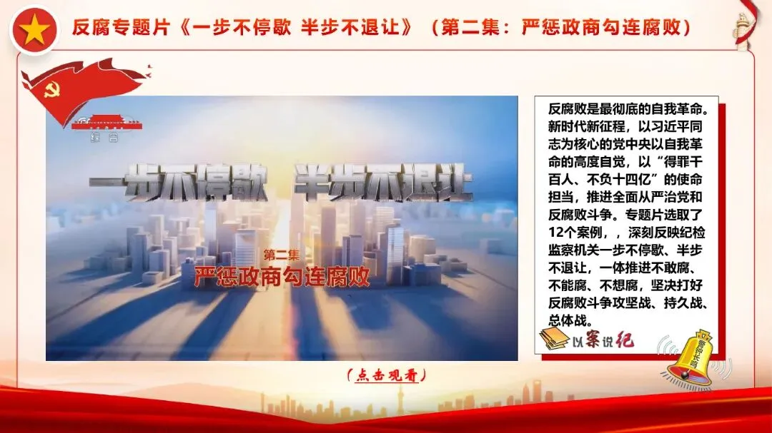 坚持以党的政治建设为统领,压实全面从严治党主体责任、第一责任人责和“一岗双责”落实,反腐败一步不停歇、半步不退让,保持反腐惩恶高压态势,深化师生身边腐败问题集中整治,坚决铲除腐败滋生的土壤和条件,坚决打好党风廉政建设和反腐败斗争攻坚战、持久战、总体战。要深入贯彻落实中共中央办公厅、国务院办公厅印发《关于做好2026年元旦春节期间有关工作的通知》和中共中央纪委印发《关于做好2026年元旦春节期间正风肃纪工作的通知》要求,严格落实中央八项规定及其实施细则精神和严格执行党的“六大纪律”要求,巩固拓展学习教育成果,推进作风建设常态化长效化,常态化开展党性教育、纪律教育、警示教育、节日廉情教育,观看电视专题片《一步不停歇 半步不退让》(第二集:严惩政商勾连腐败),对近期查处的典型违纪违法案件进行警示学习解读,以案为鉴,以案明纪,以案促改。通过观看警示教育片,深刻剖析违纪典型案例,用身边事教育身边人,强化警示震慑。推动全面从严治党向纵深发展,以改革精神和严的标准管党治党,树立和践行正确政绩观,激励广大党员干部敢闯敢试、敢为人先、埋头苦干,增强师生法制意识,抓实校园涉稳、防范宗教渗透、意识形态工作等,组织教师思政学习(2026年度全国基础教育重点工作部署会精神深度解读),以优良作风凝心聚力、真抓实干,不断开创事业发展新局面。持续巩固思想防线筑牢拒腐防变堤坝,锲而不舍、坚定不移、持之以恒推动正风肃纪反腐向纵深发展,努力营造风清气正的政治生态和良好教育环境。
