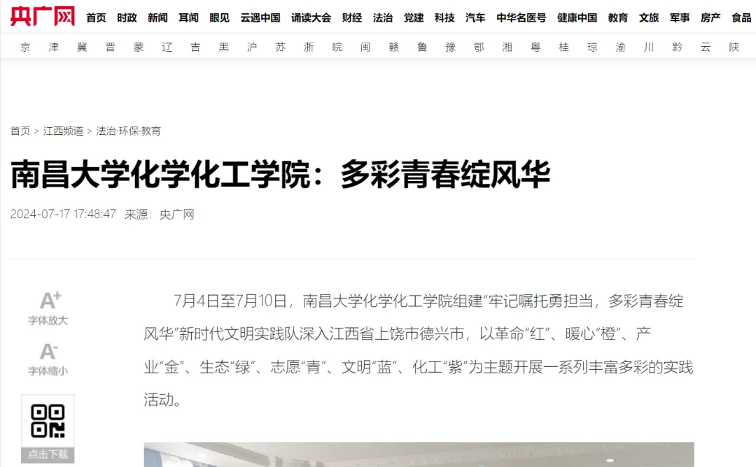 7月4日至7月10日,南昌大学化学化工学院组建“牢记嘱托勇担当,多彩青春绽风华”新时代文明实践队深入江西省上饶市德兴市,以革命“红”、暖心“橙”、产业“金”、生态“绿”、志愿“青”、文明“蓝”、化工“紫”为主题开展一系列丰富多彩的实践活动。