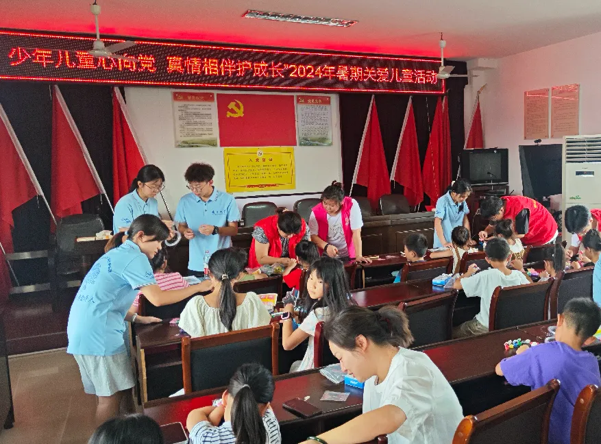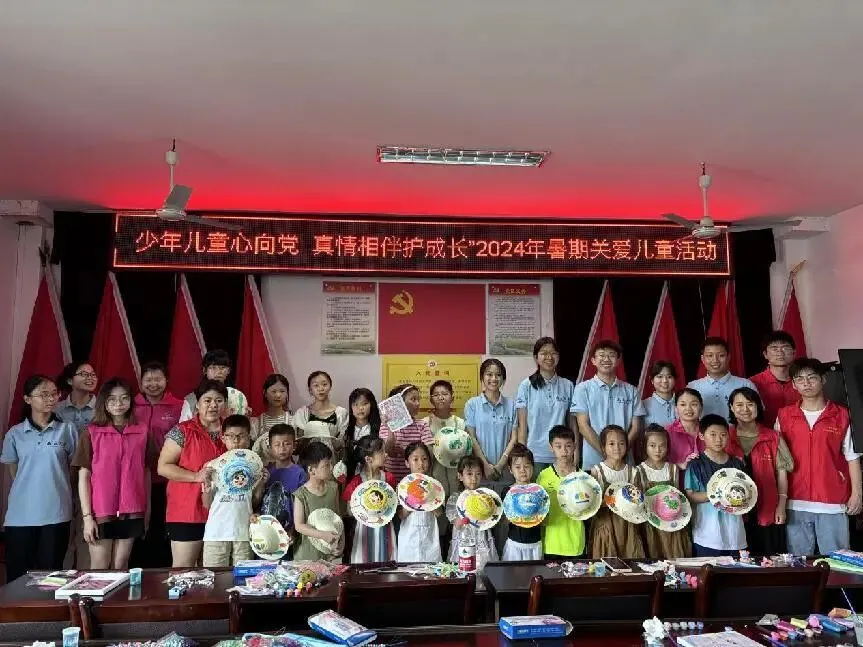随后,实践队联合德兴市妇联、香屯街道党工委、香屯村开展“少年儿童心向党,真情相伴护成长”2024年暑期关爱儿童活动,带领孩子们一起开展了草帽绘画、串珠手链、涂色油画、贴钻石画、积木拼接、折星星瓶、趣味实验等丰富多彩、形式多样的手工活动。