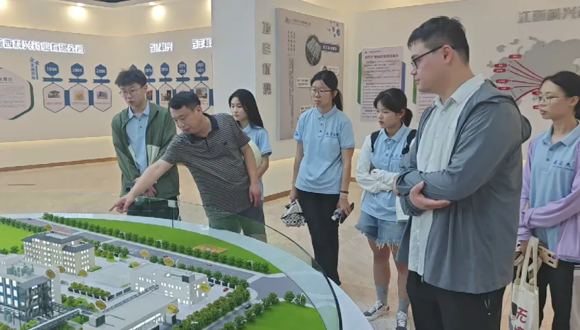 在江西科兴药业有限公司的企业展览馆中,实践队队员们参观了公司发展历程、主流产品简介以及未来发展规划,深切感受到园区对于专业人才的高度需求与殷切期望。