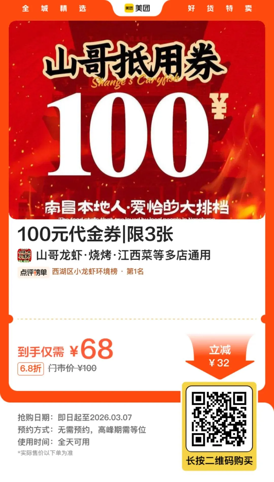 >南昌「山哥龙虾·烧烤」优惠券:68抵100(可叠加)