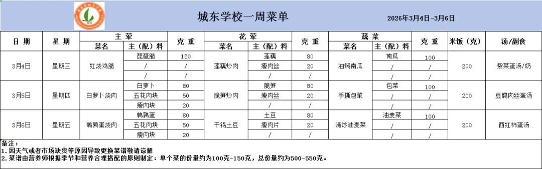【每周食谱】南昌县城东学校健康带量食谱(2026年3月4日-3月6日)