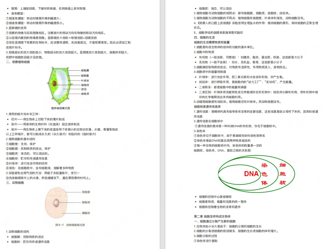 ✅ 生物部分——这些高频考点一定要背熟• 细胞结构:植物细胞有细胞壁、叶绿体、液泡;动物细胞没有(提纲第3-4页)• 三大作用:光合作用、呼吸作用、蒸腾作用的公式和区别(提纲第9-10页)• 遗传规律:显性基因D,隐性基因d;DD、Dd显性状,dd隐性(提纲第33页)• 人体八大系统:消化、呼吸、循环、泌尿、神经、内分泌、生殖、运动(提纲第12-18页)