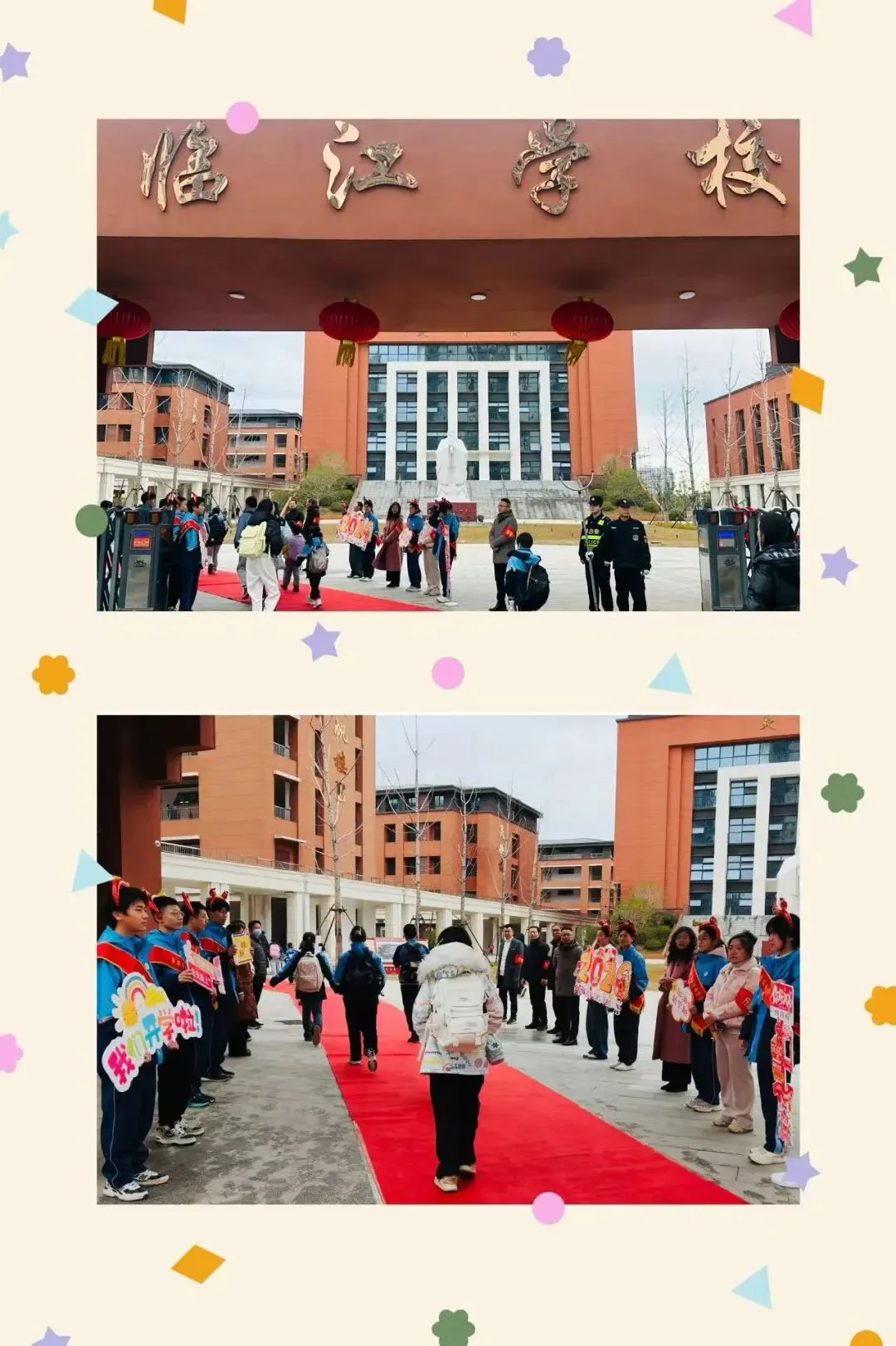 清晨,校领导、老师和学生在校门口热情迎接每一位同学,亲切问候、温暖指引,校园处处洋溢着蓬勃朝气。
