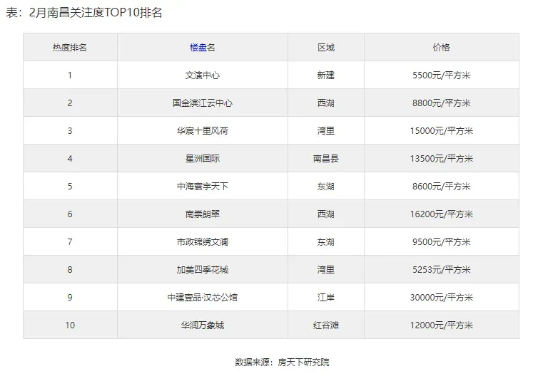 2月南昌楼盘关注度排名出炉!