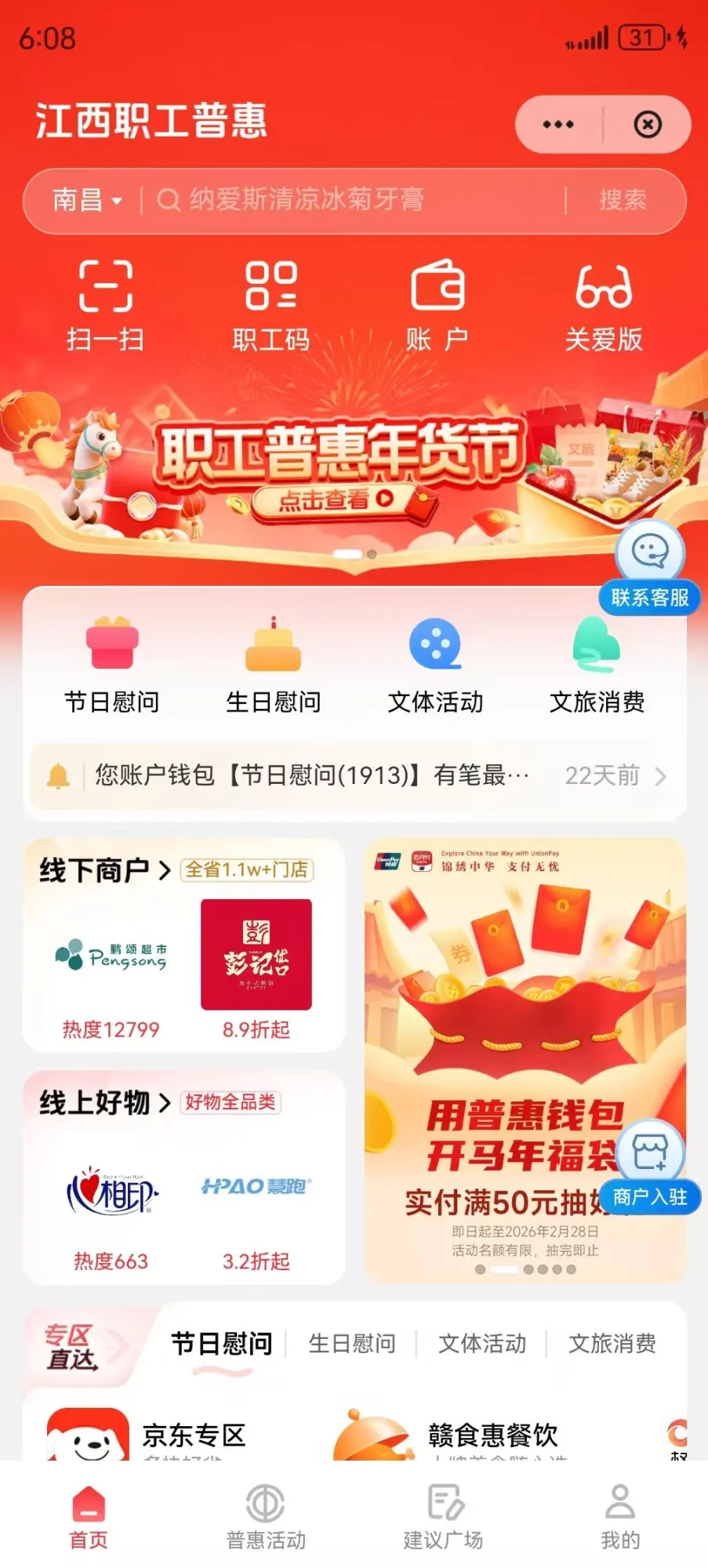 2025年,我司协同江西省总工会、江西银联策划开发江西职工普惠平台,解决职工慰问及活动经费资金安全、使用合规便利问题,该项目启动一年内已服务全省2万家基层工会、100余万职工,带动消费10亿元,列为全国银联重点项目。