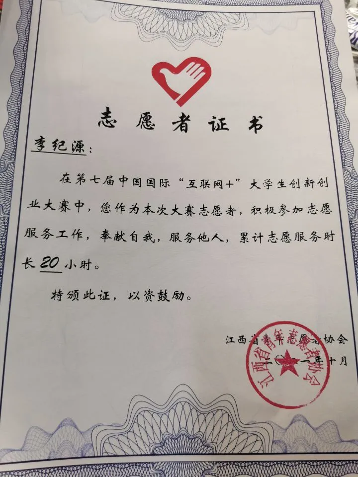 图右为李纪源同学在“互联网+”大赛志愿者活动证书)