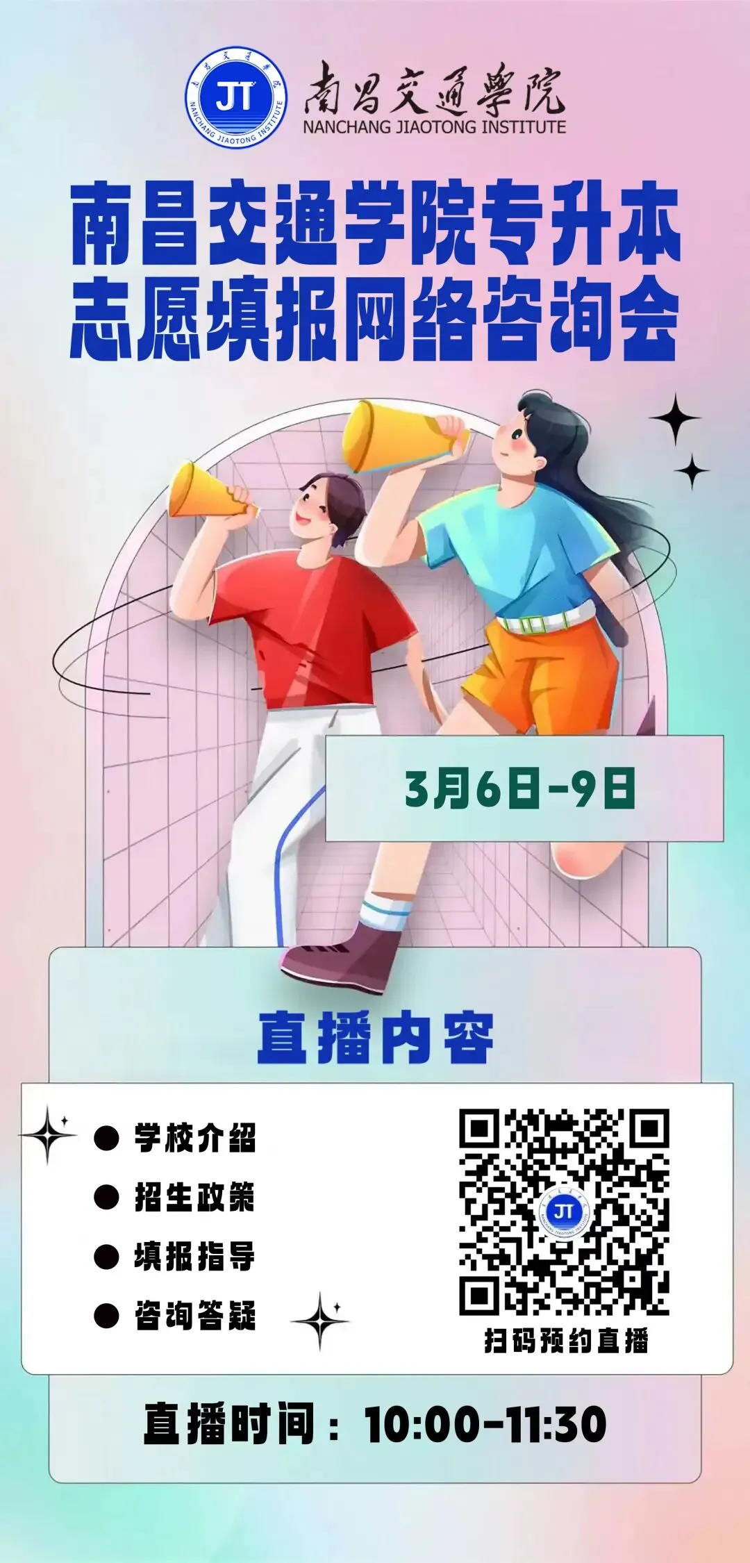 为帮助广大考生全面了解2026年专升本志愿填报规则,准确把握报考方向,我校将开展网络直播咨询会。本次直播将围绕招生政策、填报指导等关键内容进行详细讲解,并在线解答考生疑问,欢迎各位考生及家长准时收看。