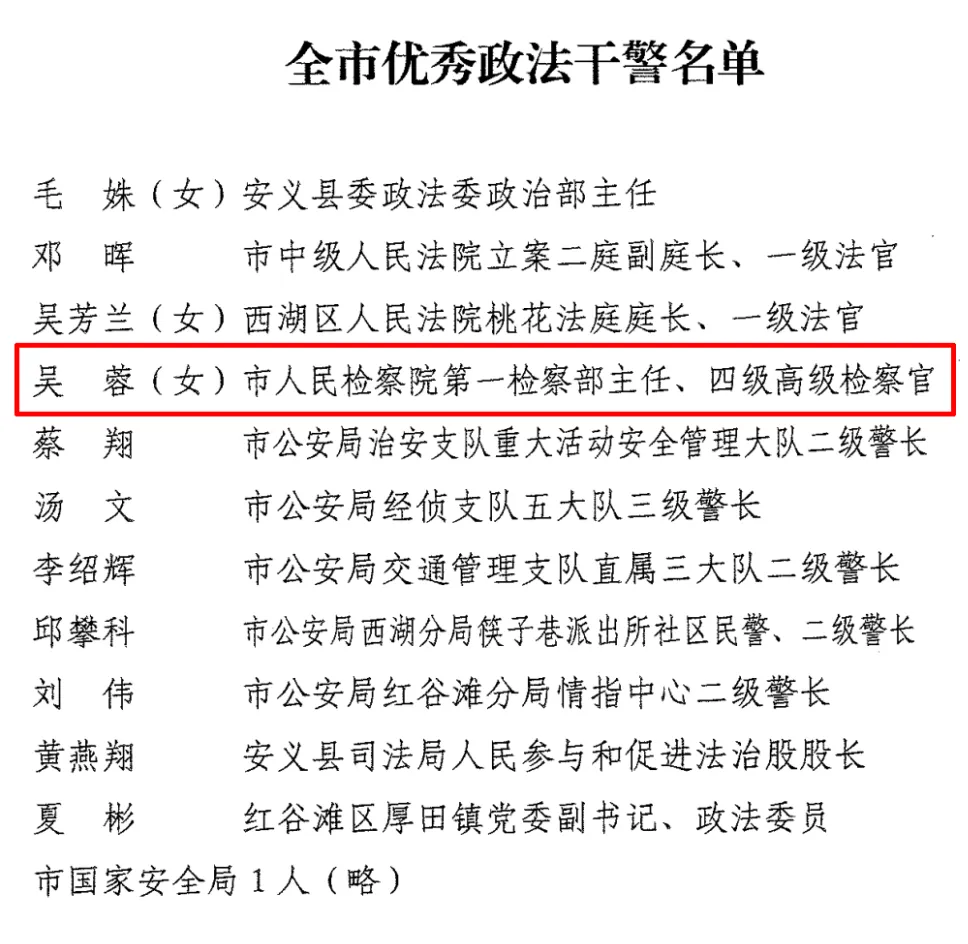 该同志深耕检察工作三十余载,先后在办公室、批捕处、公诉处、控告申诉处、检务督察部、第一检察部等岗位任职,曾荣获“全国打击危险废物环境违法犯罪和污染源监测数据弄虚作假违法犯罪工作表现突出个人”、“江西省检察机关十佳公诉人”、“江西省巾帼建功标兵”等荣誉。