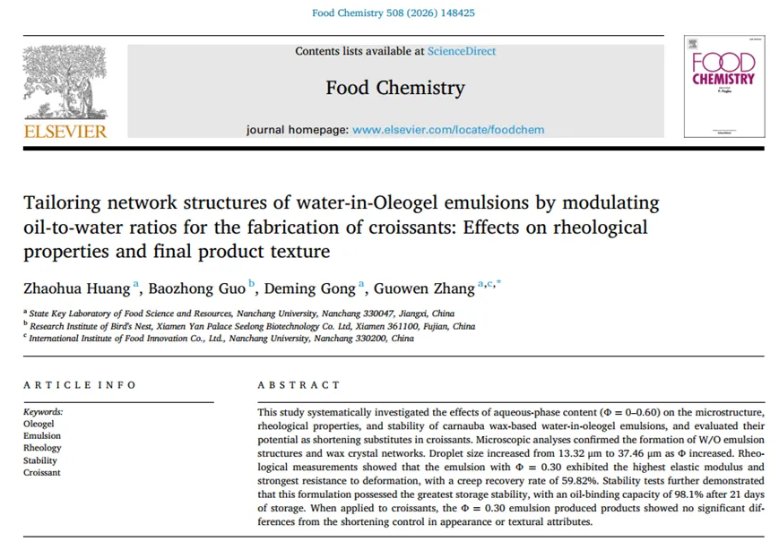 近日,南昌大学食品科学与资源挖掘全国重点实验室黄兆华(第一作者)、张国文教授(通讯作者)等在国际食品顶刊《Food Chemistry》(Q1, IF9.8)发表了题为“Tailoring Network Structures of Water-in-Oleogel Emulsions by Modulating Oil-to-Water Ratios for the Fabrication of Croissants: Effects on Rheological Properties and Final Product Texture”的研究论文。可颂面包因其独特的酥脆口感和浓郁风味而广受喜爱,然而其较高的饱和脂肪含量引发了显著的健康担忧。已有充分研究表明,在酥皮面团制品中减少黄油用量或使用液态油替代往往会导致不良的质地缺陷。本研究提出了一种通过添加仅由巴西棕榈蜡稳定的无表面活性剂油凝胶乳液以开发低脂、清洁标签可颂的新方法。