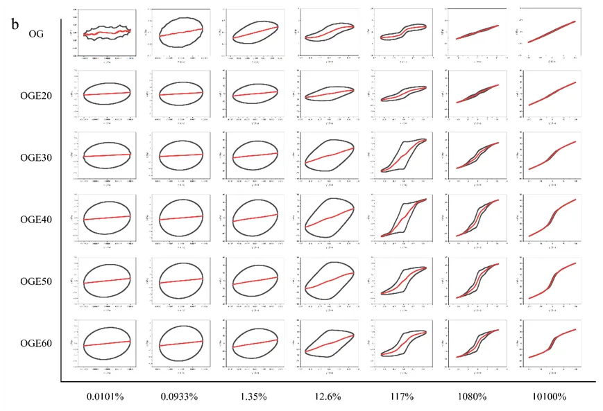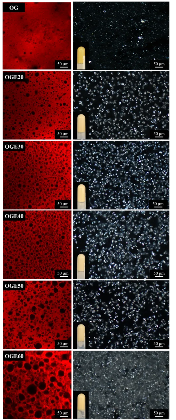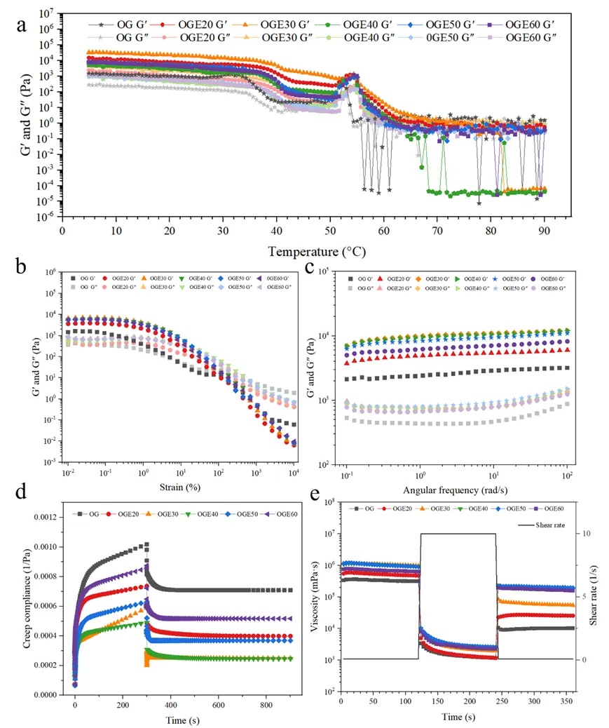 本研究明确了水相分数是调控巴西棕榈蜡基油凝胶乳液的界面结晶行为、流变特性及功能稳定性的关键结构参数。在中等水相比例(Φ = 0.30-0.40)下,优化的液滴堆积与界面覆盖率促进了蜡晶的有效锚定,从而增强了体系的粘弹性强度,提升了储存稳定性,并在完全熔融状态下表现出显著的热稳定性,其表观粘度较纯油凝胶高出二至三个数量级。从机理上分析,界面结晶与液滴拥挤效应的协同作用,补偿了高温下连续晶体网络的损失,从而在动力学上抑制了液滴的迁移与聚结。相比之下,水相比例不足(Φ ≤ 0.20)或过量(Φ ≥ 0.60)的体系则表现出界面负载失衡与功能性能下降。在酥皮面团体系中的应用进一步证实,Φ = 0.30配方下的油凝胶乳液能达到与商业起酥油相当的结构和感官特性,这表明通过调控水相分数是设计适用于烘焙领域的热稳定型油凝胶乳液的有效策略。Fig. 1 Macroscopic appearance and microscopic images of OG and OGEs with varying aqueous phase fractions (0.20-0.60). Left column: confocal laser scanning microscopy; right column: polarized light microscopy. Scale bar: 50 μm.Fig. 2 Rheological properties of OG and OGEs with different aqueous phase fractions (0.20-0.60). (a: temperature sweep; b: strain sweep; c: frequency sweep; d: creep-recovery; e: three-interval thixotropy test).Fig. 3 Elastic (a), viscous (b) Lissajous-Bowditch curves of OG and OGEs with different aqueous phase fractions (0.20-0.60).