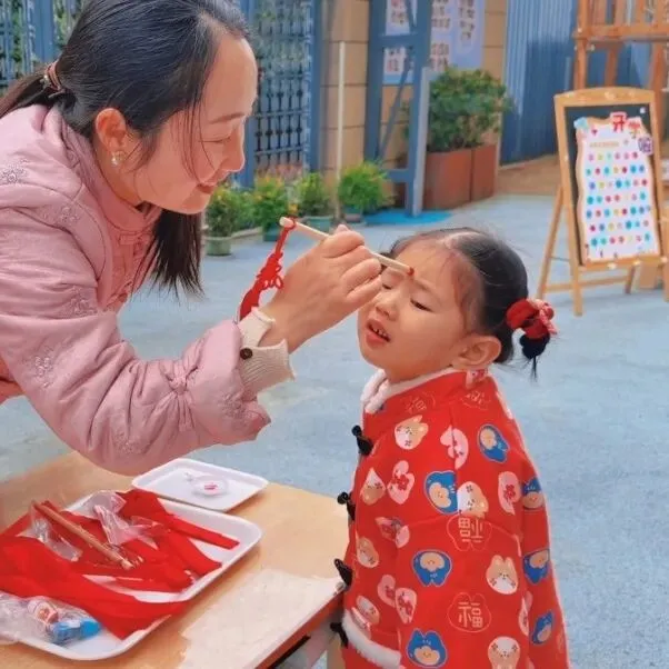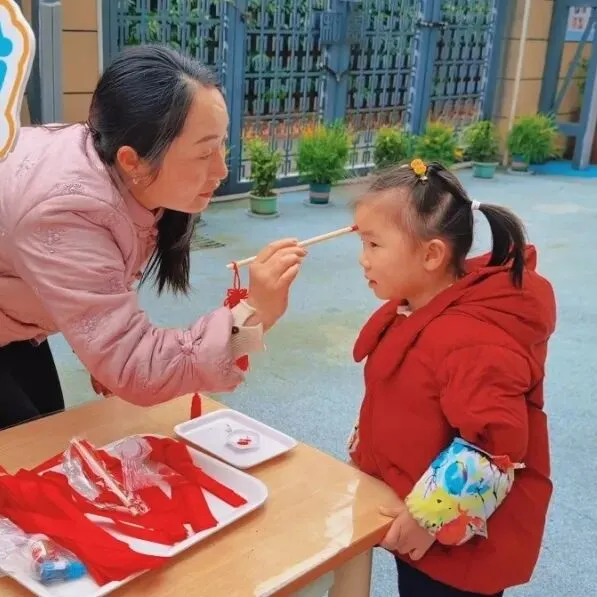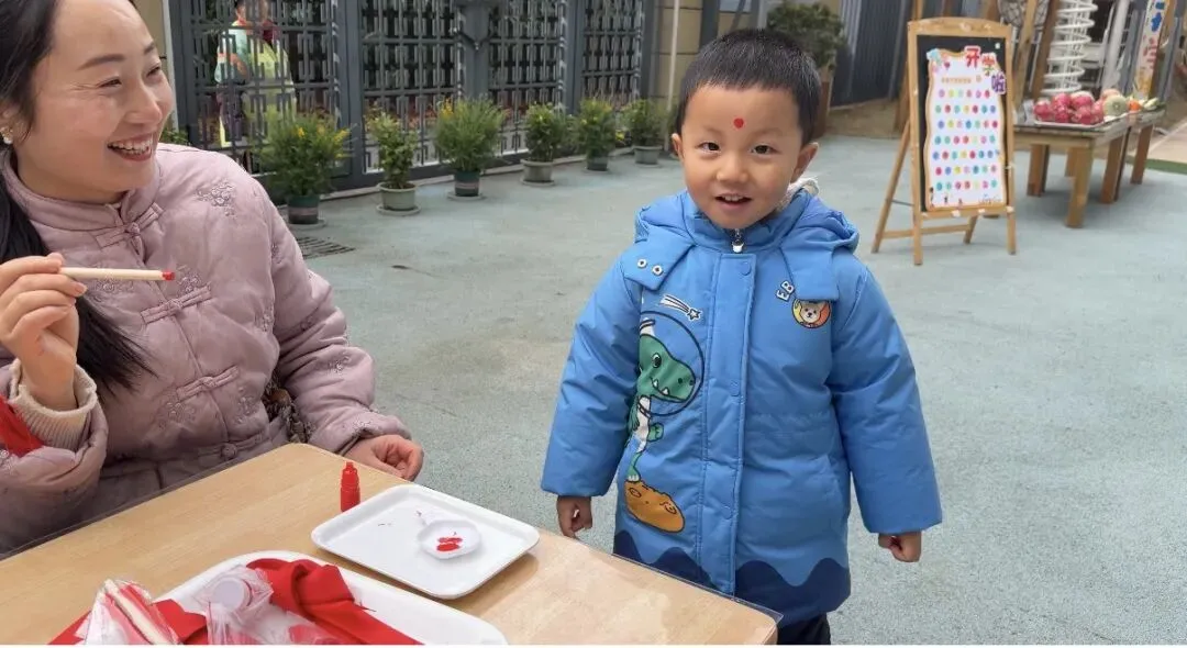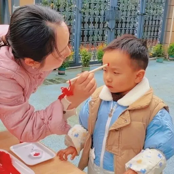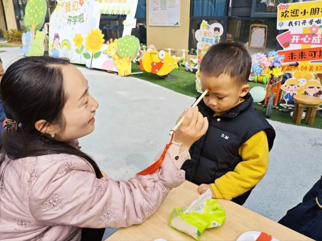 作为开学典礼的首个环节,老师手持启智笔,蘸取鲜红的朱砂,在宝贝们的额头轻点一枚朱砂痣。这一传统的“开天眼”仪式,寄望宝贝们新学期眼明心亮、好学善思,在知识的海洋里快乐探索,迈出成长的智慧第一步。