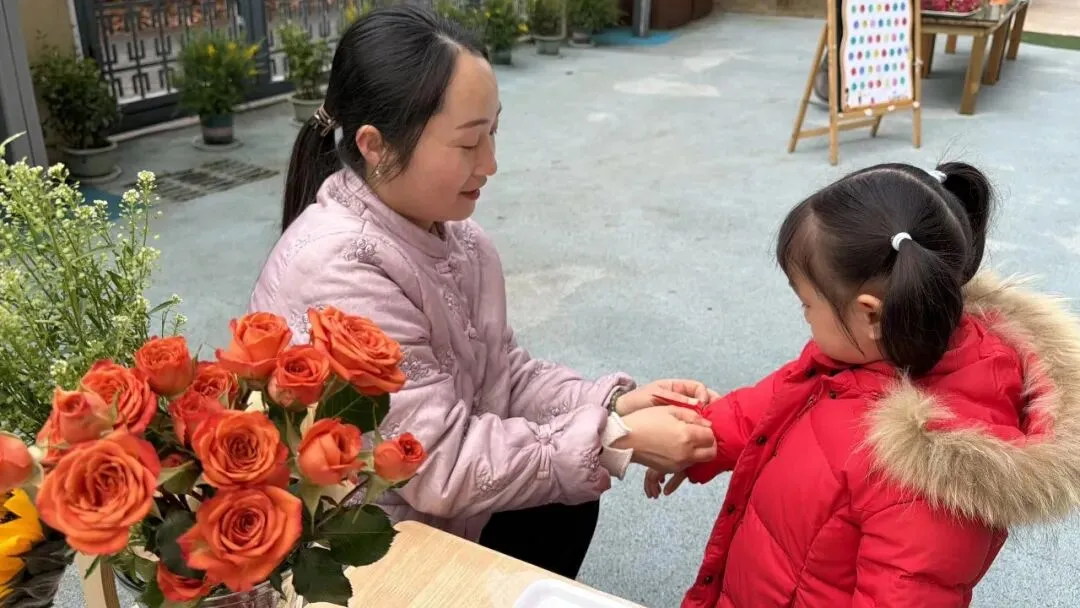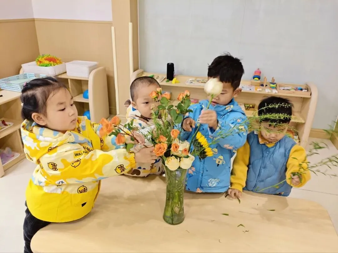 老师为宝贝分发鲜花,宝贝认真地将花枝插入瓶中,用小手创造美好,把春天搬进托育中心。在动手实践中感受万物复苏的春日气息,种下对美好春天的无限期待。