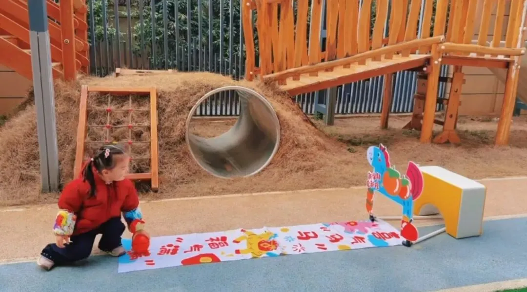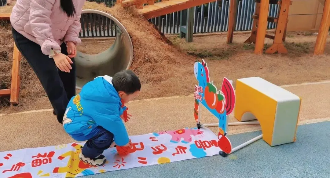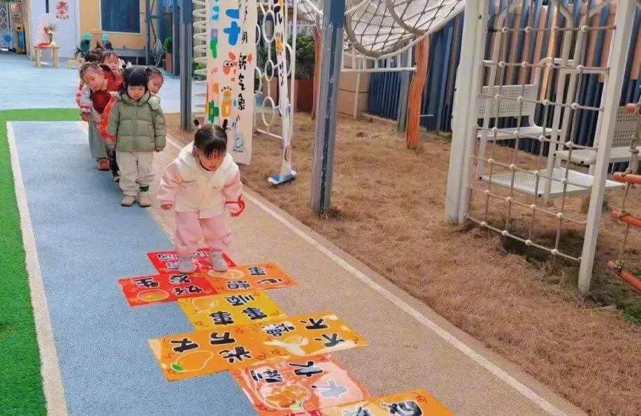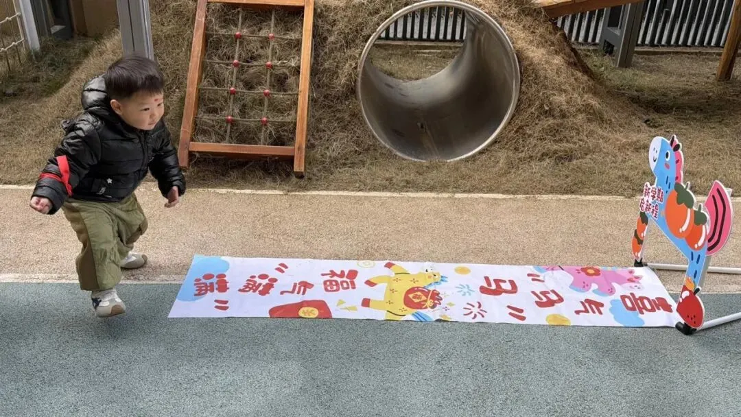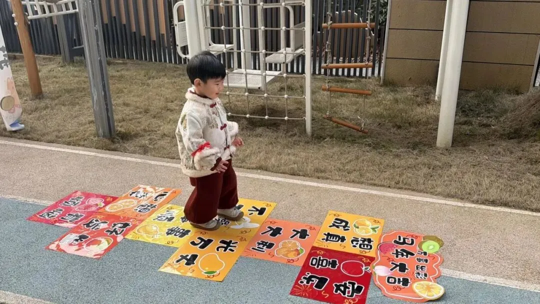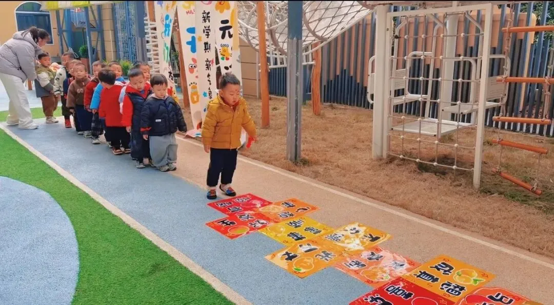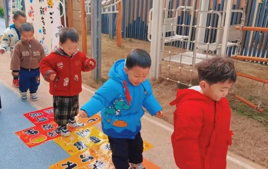 地面上的福格贴纸印着“健康成长”“马到成功”“快乐无忧”的暖心祝福,宝贝们排着队蹦蹦跳跳,每跳一格便大声念出祝福语,在趣味游戏中收获满满福气,步步迈向新成长。