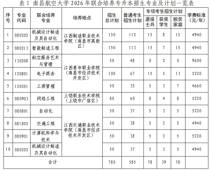 我校2026年联合培养专升本招生计划共计780人,具体情况详见表1。