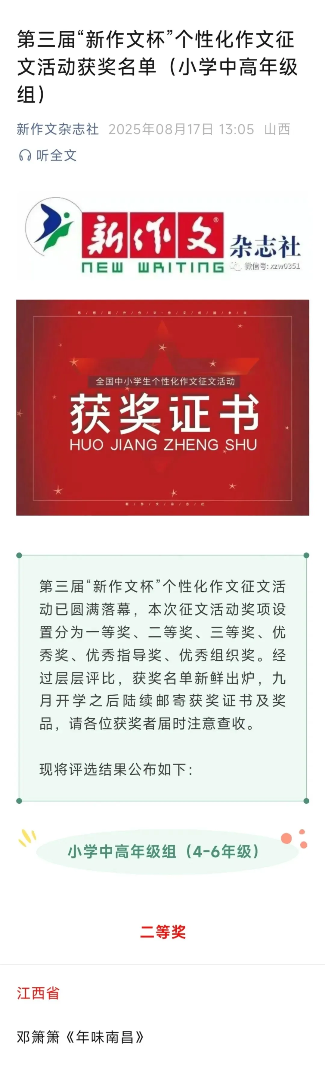 箫箫的《年味南昌》写作于2025年2月6日,以生活为素材,在原稿的基础上,我同她一起讨论增加、修改部分语句后,较好地突出了“年味”这一主题。6月份在“新作文”公众号看到第三届“新作文杯”个性化征文征稿启事后,我便给她投稿至征文邮箱。今天收到通知,获得二等奖,贺老师也获得优秀指导奖。