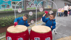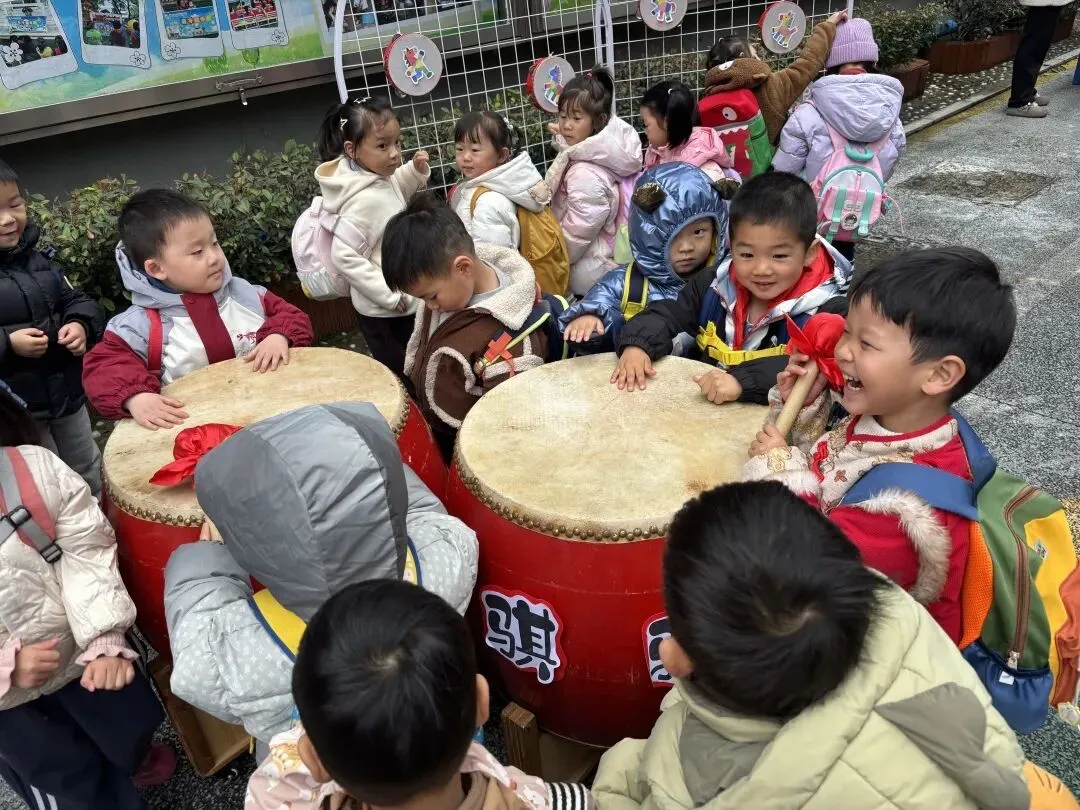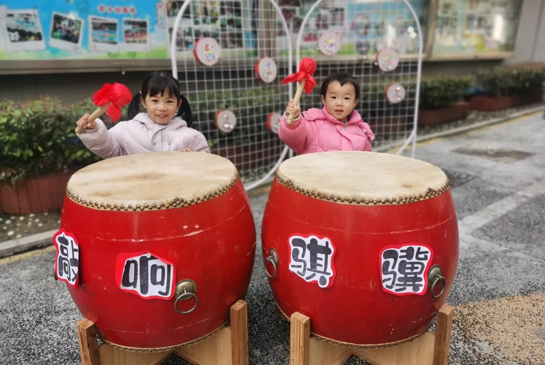 “咚咚咚!咚咚咚!”现场传来阵阵激昂的鼓声。孩子们拿起鼓槌,昂首挺胸,用力敲响大鼓。每一声铿锵鼓点都满载着他们对未来的美好期许。