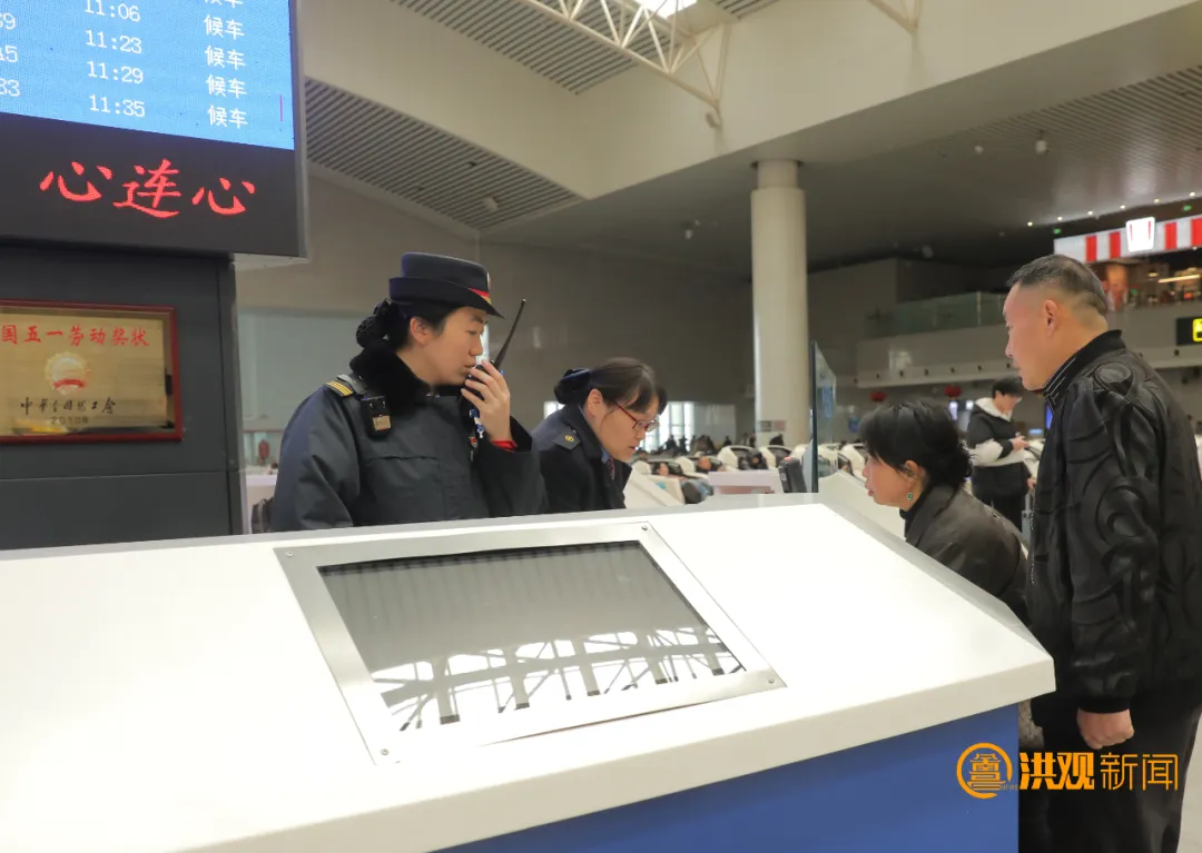 安检口、售票窗、站台边,处处可见忙碌的身影。“红土情·英雄韵”服务台旁,客运员韩萌梦和同事万伟正俯身倾听旅客诉求,一边点头回应,一边认真记录,一个微笑、一声问候、一次搀扶,都传递着最朴素的温暖。
