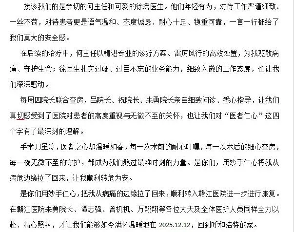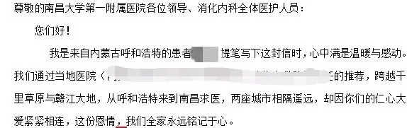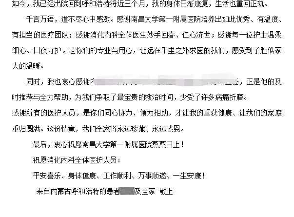 这面跨越山河的锦旗与情真意切的感谢信,不仅承载着对精湛医术的深深信任,更凝结着对全体医护人员温暖关怀的由衷感激。从精准的CT引导穿刺,到微创的内镜下清创,再到护理团队的全程守护,体现的是现代医学技术与人文关怀的结合。 一面锦旗寄深情,一生感恩护健康,锦旗是鼓励,更是责任。在重症胰腺炎治疗这条充满挑战的道路上,南大一附院消化科团队将继续以技术为舟,以仁心为桨,为每一位信赖他们的患者摆渡生命,从疾病的彼岸驶向健康的港湾。