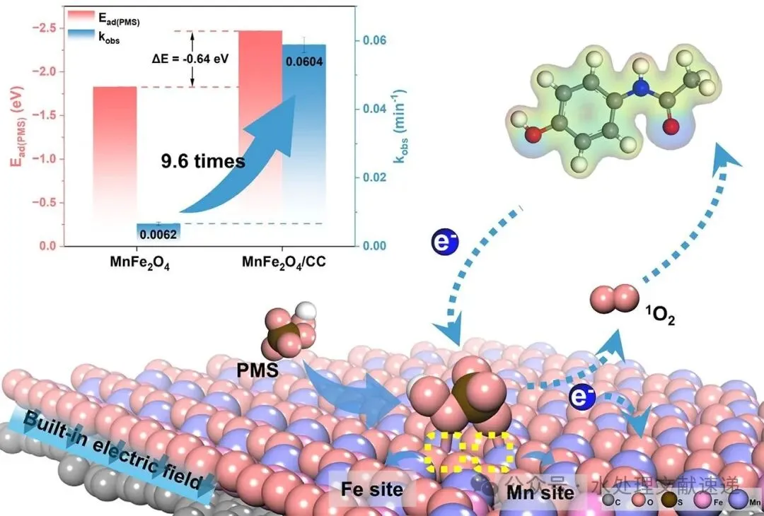 Fig. 2. a) ACT degradation curves in different systems (Conditions: [ACT] = 0.01 g/L, [catalyst] = 0.1 g/L, [PMS] = 0.3 mM, T = 30 °C); b) PDOS of CC, MnFe2O4 and MnFe2O4/CC; c) charge difference distribution at the interface of MnFe2O4/CC, red and yellow indicate charge accumulation and depletion; d) work function of CC, MnFe2O4 and MnFe2O4/CC; e) schematic of electron transfer driven by energy band differences; f) schematic of electron transfer in BIEF. (For interpretation of the references to colour in this figure legend, the reader is referred to the web version of this article.)